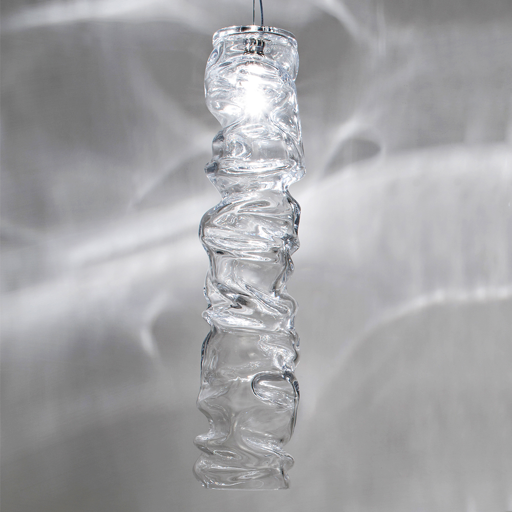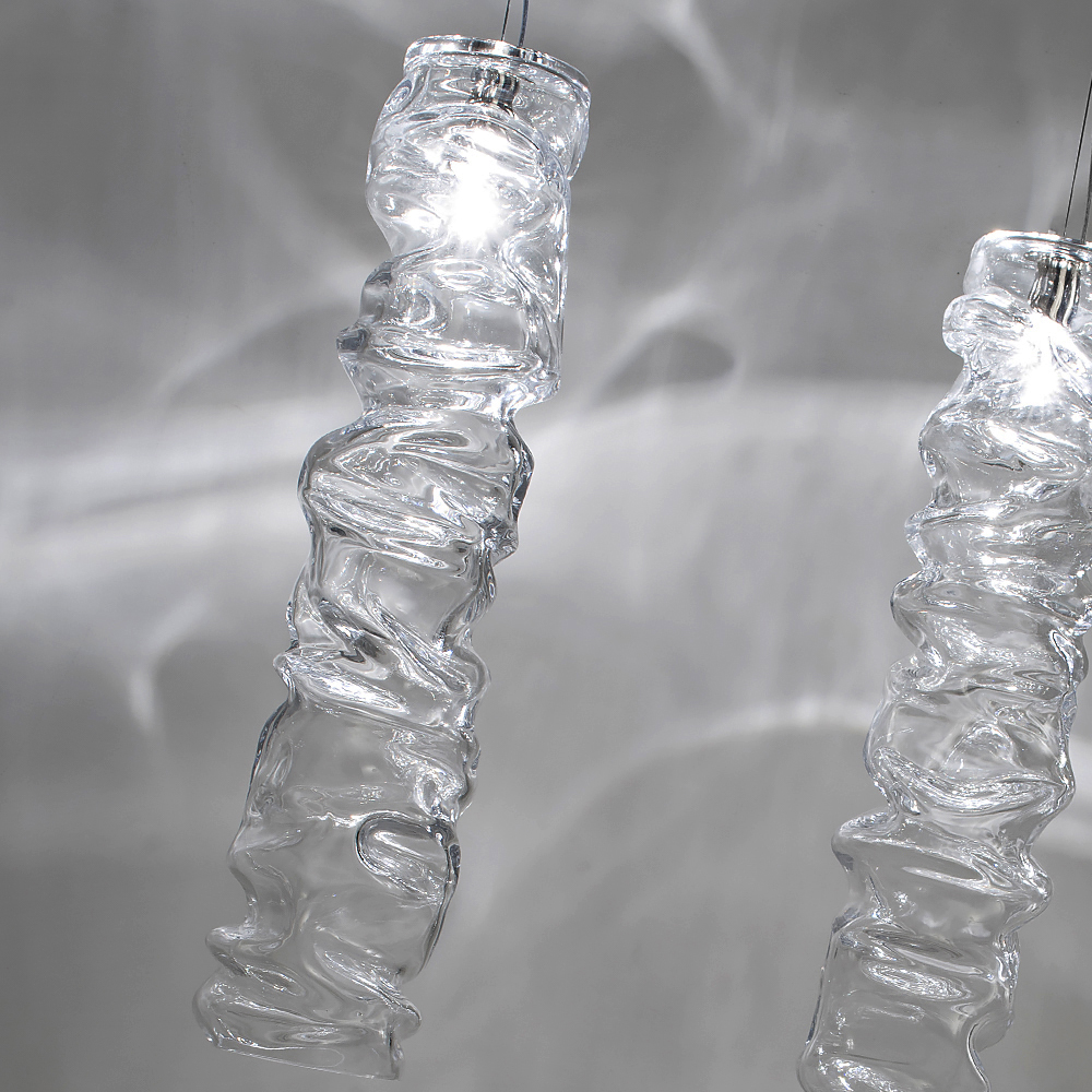 Modern Italian Designer Crystal Pendant Light. Taking its cues from natural forms this quirky modern pendant light uses a ‘wrinkled’ crystal design. From a nickel ring, a tube of undulating folds of glass project light to create an unique elegant display. These beautifully made pendants would also look fabulous grouped together, as shown, for the ultimate in contemporary lighting.