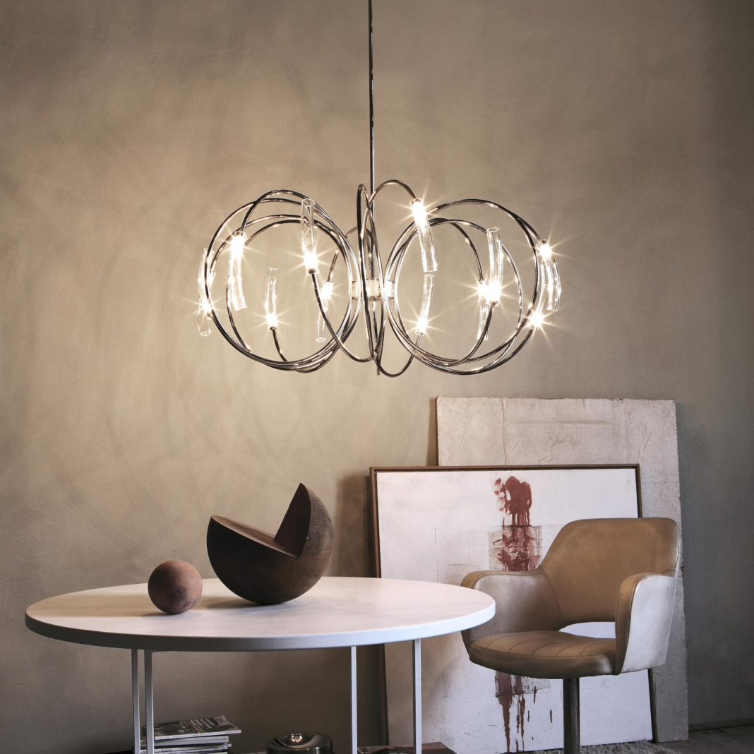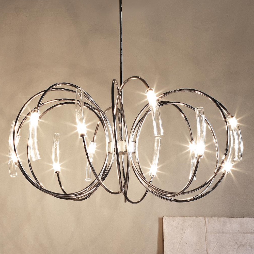 The Modern Italian Designer Pendant Chandelier is a design that takes luxury to the next level. Nickel finished arched arms radiating twelve glass diffusers creating a celestial effect, provides a stunning addition to any home.