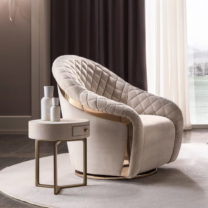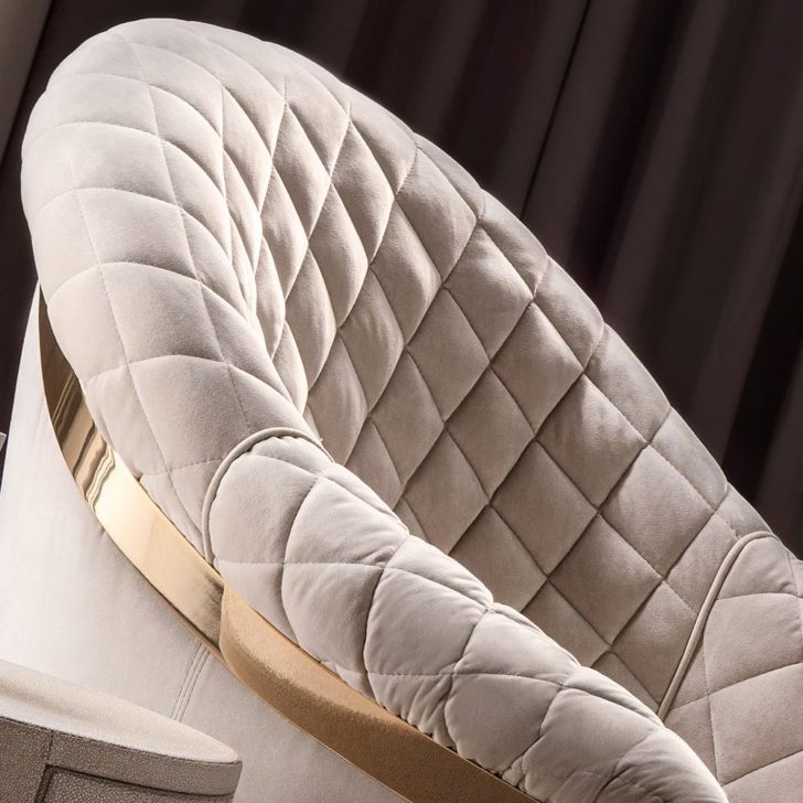 Quilted taupe nubuck extends around the sides and back of this gorgeous chair together in contrast with a smooth seat. Also features a striking burnished bronze trim detail, highlighting the gorgeous curved of the unique armchair. A feature further complimented by an equally stunning statement rotating base, beautifully finished in the same luxurious burnished bronze, adding a retro accent. Place in a classic or modern setting for a refined contemporary feel, the ultimate in chic Italian style indeed.