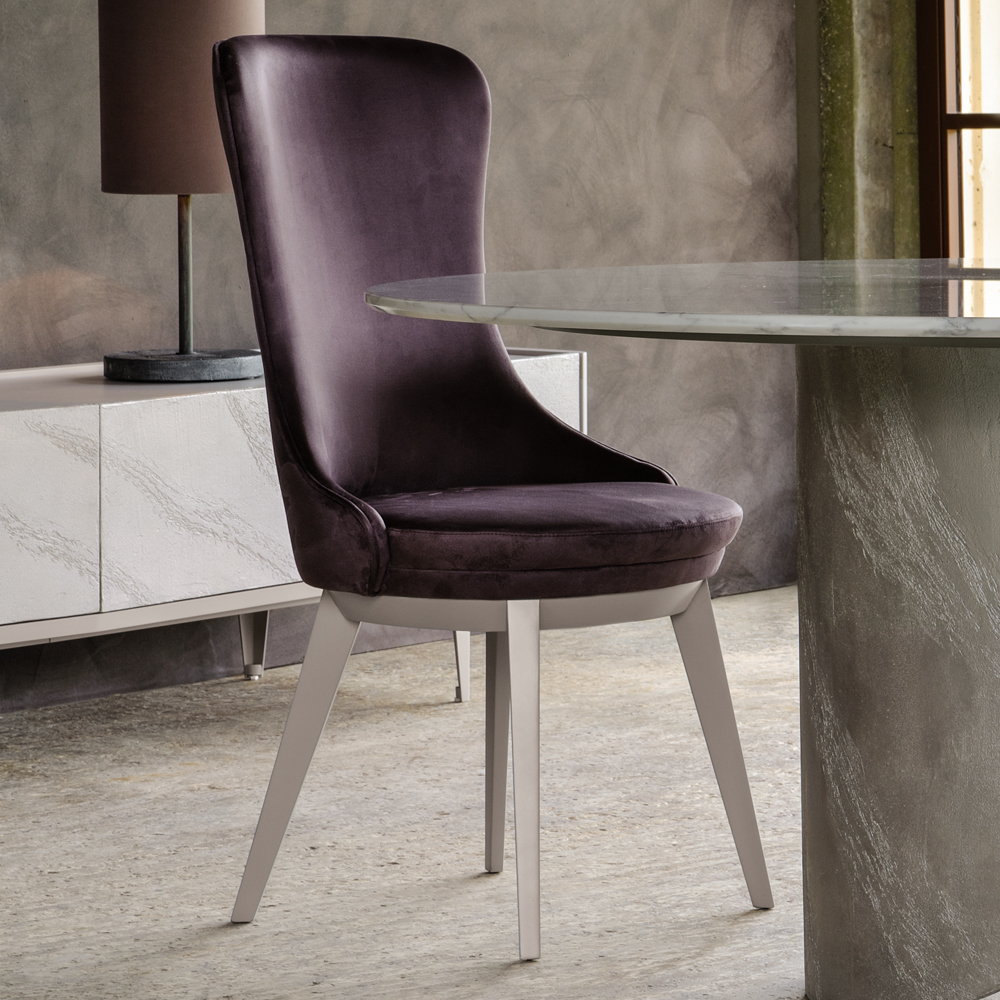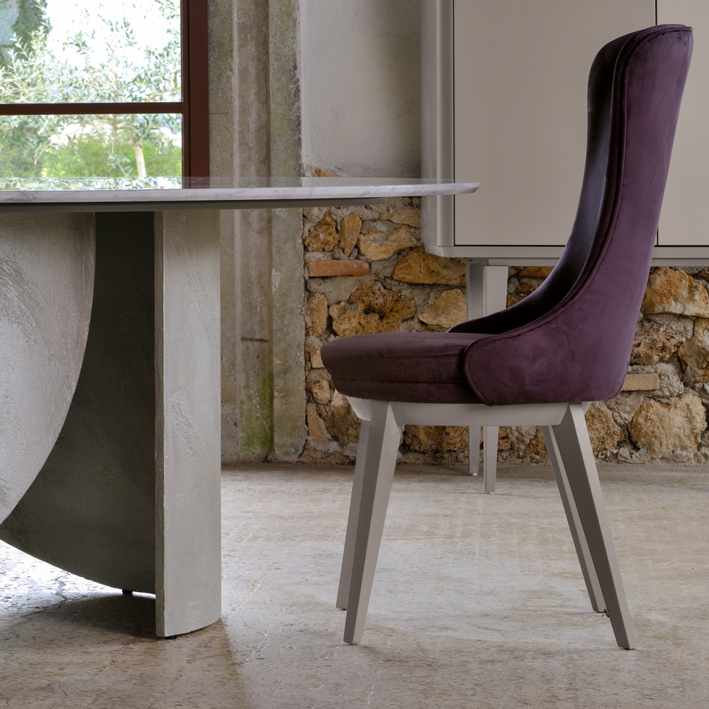 The curved wooden chairs are padded and upholstered in a rich plum velvet fabric, and supported by a wooden base and legs in a contrasting painted finish. Height 109 cm x width 65 cm x depth 53 cm. Alternative fabrics, eco-leather, leather and finishes are available upon request.