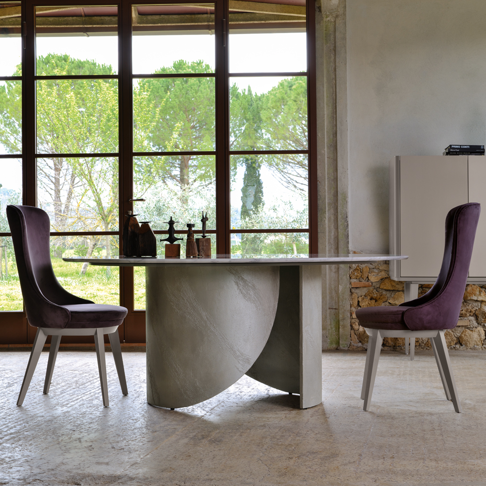 The table is dynamic by design, curved wood in a striking Rock Silver finish creating a compelling pedestal style base. Completed by an oval Bianco Carrara Marble top. Height 76 cm x width 150 cm x depth 180 cm. Alternative finishes are available upon request and with the option of a bronzed mirror, in lacquered wood, in transparent, smoked or lacquered glass.