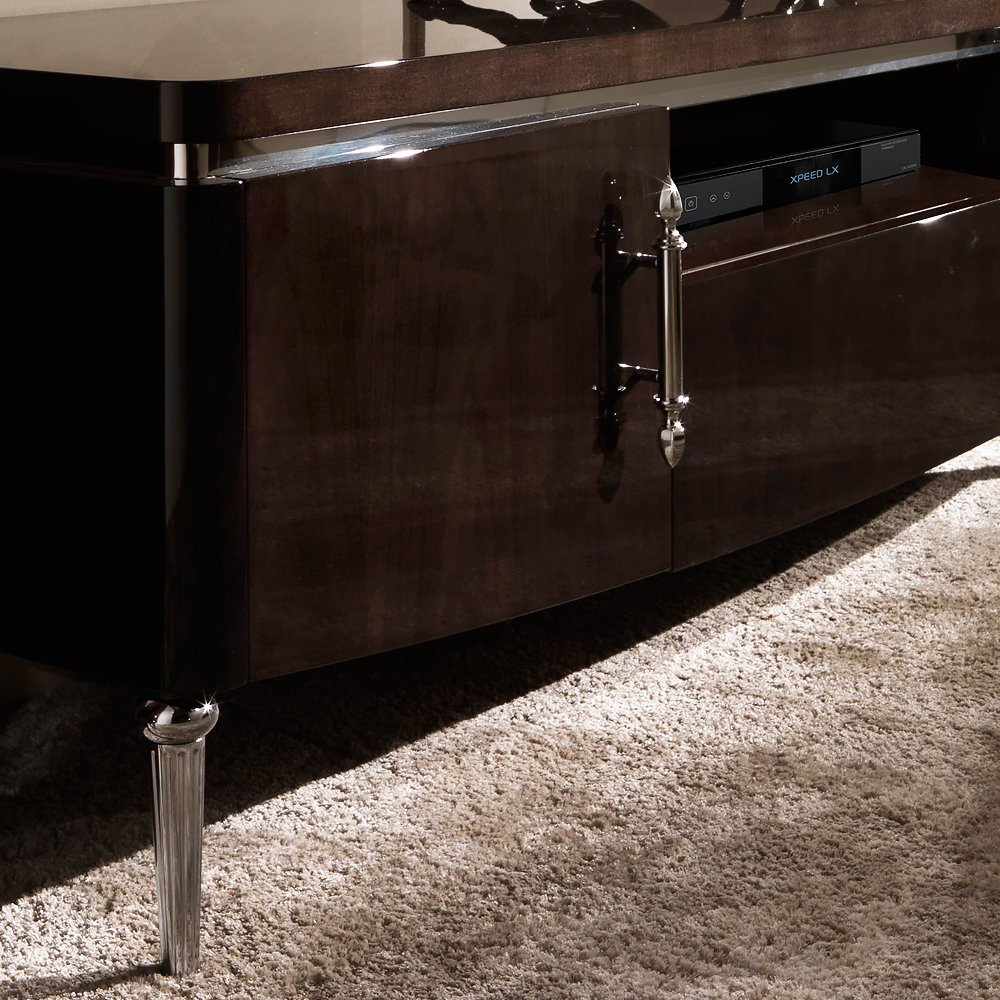Modern Italian Walnut Veneer TV Media Sideboard. This hand-crafted design offers the ultimate in unmistakable classic Italian style. Superbly executed by Italian master craftsmen this low sideboard is particularly outstanding in its attention to detail. The beautifully rounded frame is finished with a fabulous high gloss walnut veneer, together with front feet and handles cast in brass with a polished chrome finish. Includes a polished chrome detail, altogether providing eye-catching accents.