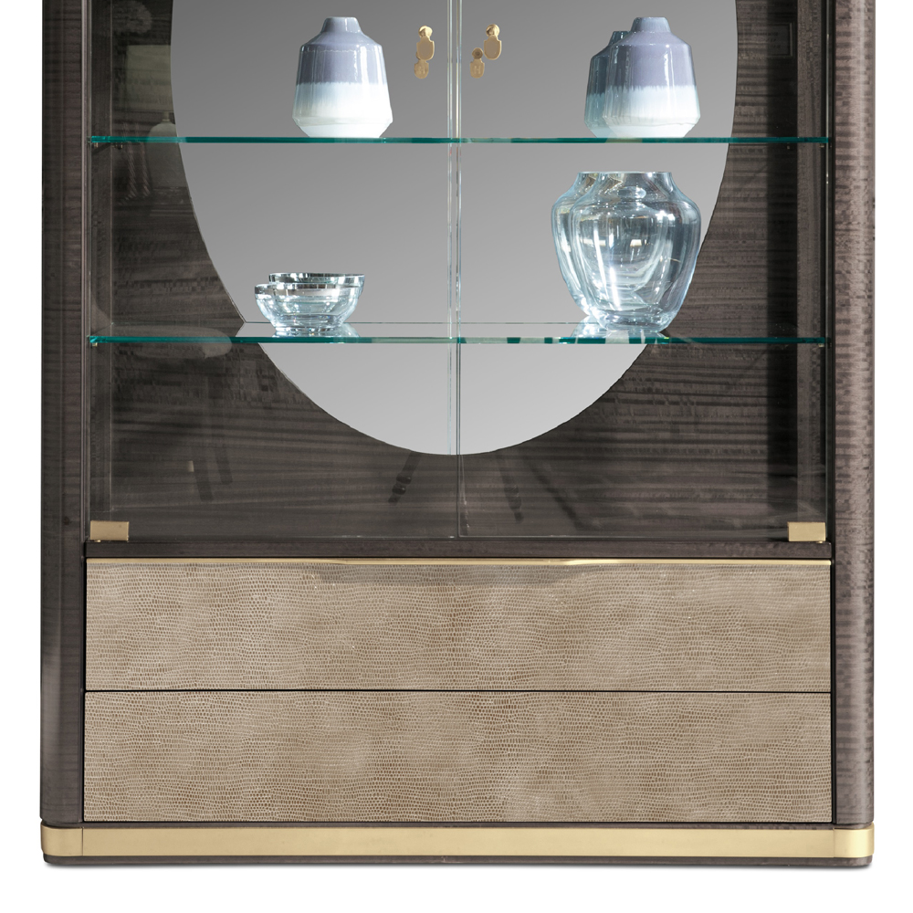 This classy fixture features a high sheen grey eucalyptus finish and is complemented by a patterned tan leather front and a sleek brass trim. Complete with two drawers, five internal shelves, and a mirror on the back panel. Internal LED lighting included. Available in a variety of finishes. Prices will vary.