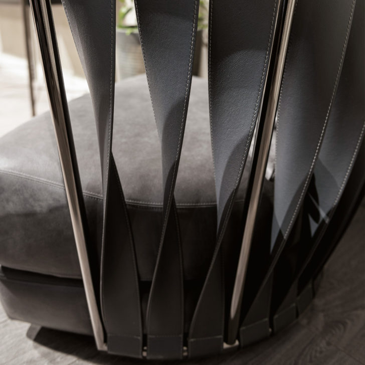 A fabulous design made of solid wood, and padded to the highest industry standards in different densities. Beautifully upholstered in a black suede leather, together with unique upholstery to the back of the armchair. Beautifully created from twisted strips of the finest anthracite leather supported by a high back-rest frame in a glorious black nickel finish. Complete with refined contemporary feet, in a striking black matt lacquer. Back cushion included. Available in alternative luxury upholstery leathers and finishes, including luxurious frames beautifully finished in a stunning pale gold, bronze, copper or metallic iron. Bespoke sizes and options upon request. Prices vary. This luxurious design epitomises modern Italian furniture, truly reflecting refined contemporary elegance, and belongs to a superb modern armchair collection also available here at Juliettes Interiors.