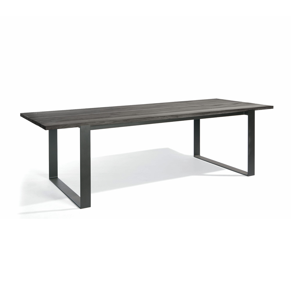 The table is created by hand. Minimal but striking by design, with its fluid wrought iron base in a matt black finish. Shown here with a black teak slatted table top. Various finish combinations are available, as shown. Prices may vary. Various table sizes available, shown here at height 75 x width 270 cm x depth 107 cm.