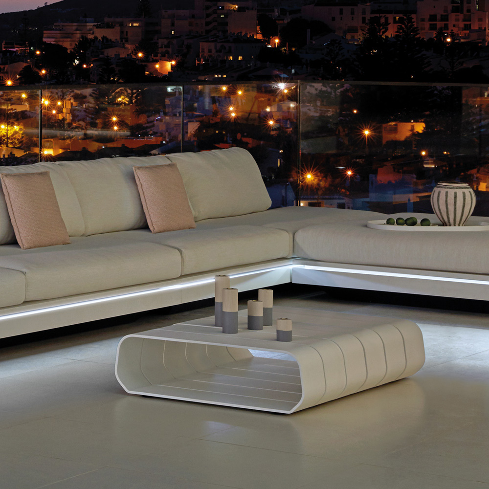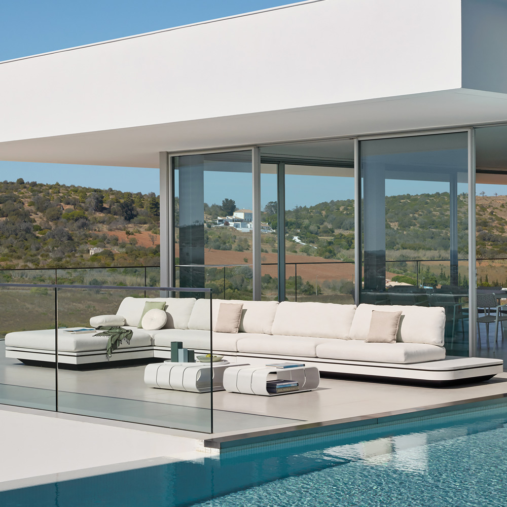 With moveable back supports that are easily adjusted in to endless arrangement options. Mixing and matching was never this easy! Superbly executed by master craftsmen this design is outstanding in its use of luxury materials and attention to detail. Technical complexity, each piece created by hand. Width 560 cm x depth 234 cm. Shown here in an intriguing mix of black and white soft touch QUARYL® for the ultimate in modern design solutions, with an optional inset remote controlled LED-lighting strip giving the illusion of weightlessness. Natural tones give the arrangement a certain prestige, offering the ultimate in seating comfort. Priced with casual cushions, which are more voluminous and have more generously lined backrests. Upholstered to the highest standard in a contemporary textured ivory inter-changeable fabric, with Combination A2 cushions. Swimming pool and sea water resistant and repellent. Easy to clean and maintain. Recyclable, GreenGuard certified, REACH certified. The finest of All Weather Fabrics, that have been specifically developed for outdoor use. The fabric is mass-coloured, UV-resistant and does not fade under the influence of light or sunshine. This design is also available in various combinations, and with standard cushions. Price will vary.