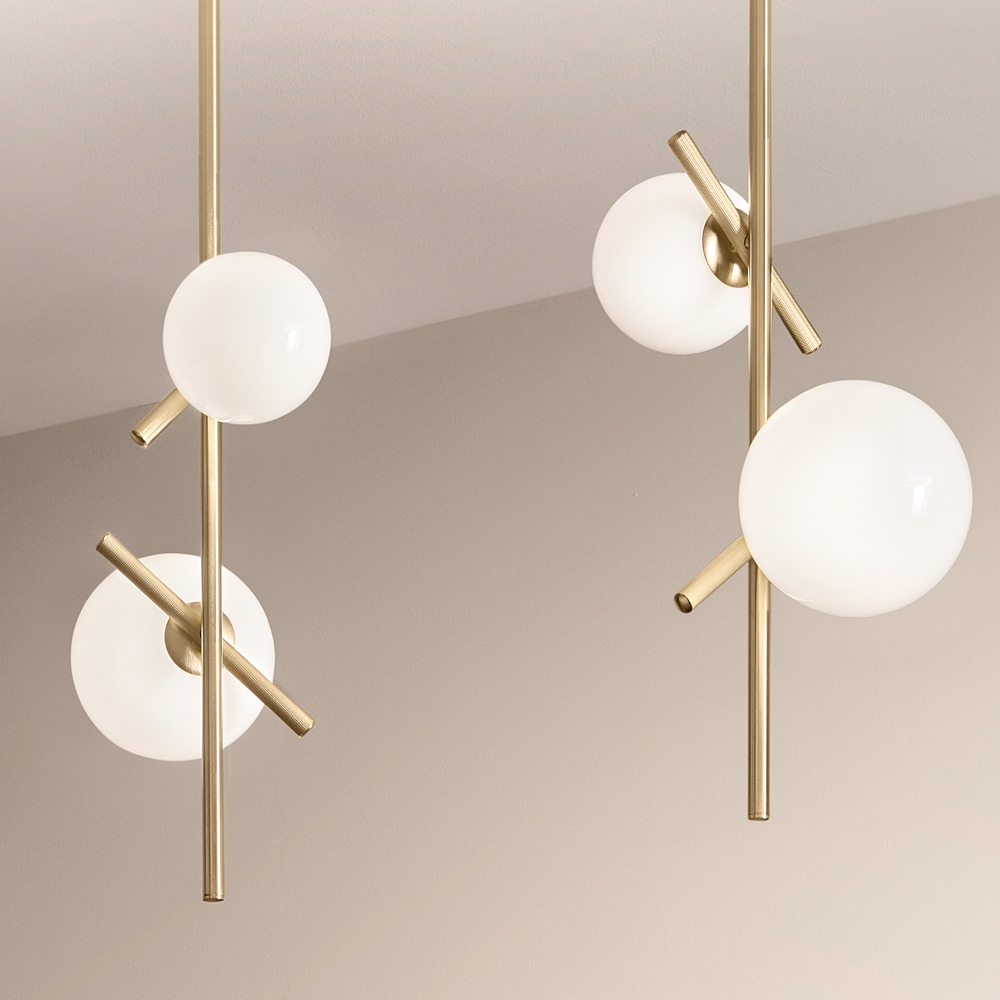 The triplex opal white Murano glass diffuser – which features as standard throughout this range – adds a supreme splash of light. This wondrous vertical pendant light is finished with etched metal detailing in a bold shade of brushed brass. This product requires 2xE14 10-watt bulbs, not included. Other metal finishes are available. This ensures a fully customisable experience, with matt painted options or galvanised styles to choose from. Prices may vary.