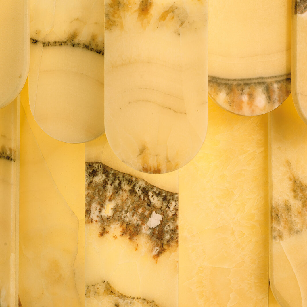 Its chocolate brown painted metal frame, adorned with onyx lozenges, elevates any space with sophistication. Weight 8.5 kg. Requires 5 x E14 x 10 W max bulbs. Bulbs not included. Traditional lighting. Compatible with a TRIAC system, with dimmable bulbs only. Available in custom sizes by request – prices will vary. Please note that all Onyx used is natural, therefore any tone differences and variations of veins are intrinsic characteristics of the natural qualities and make every single piece unique.