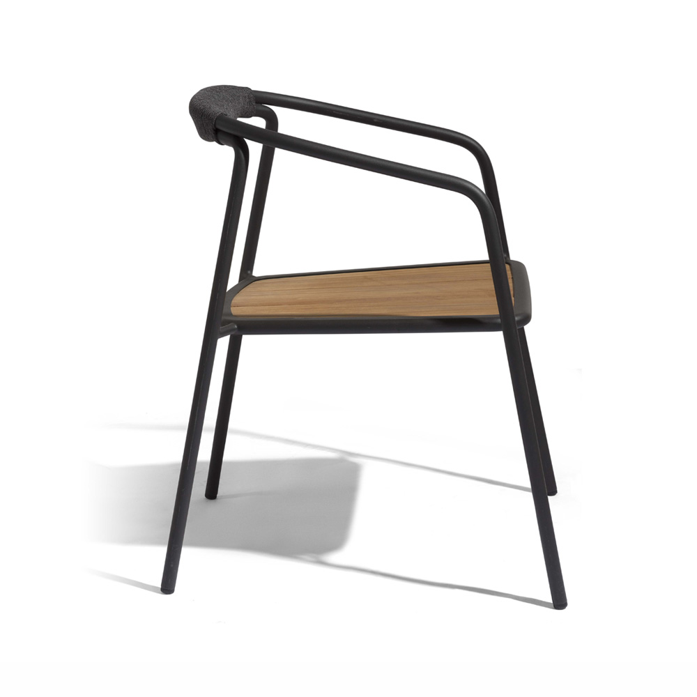 Superbly executed by master craftsmen this design is outstanding in its use of luxury materials and attention to detail. Composed of two connected frames made of bent aluminium, giving the impression of being held together by ropes. Shown here with brushed teak slatted seat panels. Seat height 45 cm + Cushion of 4 cm, overall seat height 49 cm. Weight 7 kg. Technical complexity, each piece created by hand. Shown here with an intriguing mix of a powder coated aluminium frame and contemporary 4.5 mm woven rope. Various combinations are available, as shown. Protective cover also available by request.