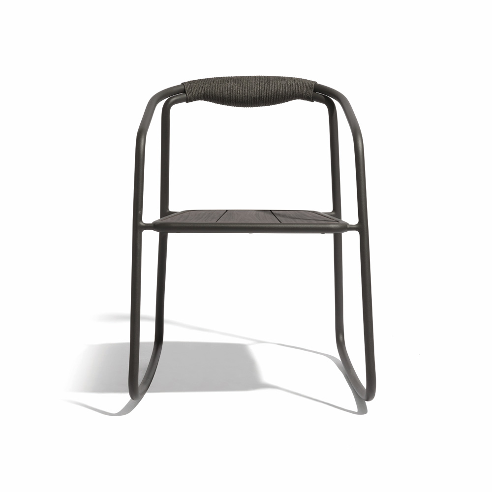 Superbly executed by master craftsmen this design is outstanding in its use of luxury materials and attention to detail. Composed of two connected frames made of bent aluminium, giving the impression of being held together by ropes. Shown here with an intriguing mix of a powder coated aluminium frame and contemporary 4.5 mm woven rope and brushed teak slatted seat panels. Seat height 44.5 cm. With optional seat cushion of 4 cm, making the overall seat height 48.5 cm. Weight 8 kg. Technical complexity, each piece created by hand. Also available with a woven rope seat. Protective cover also available by request.
