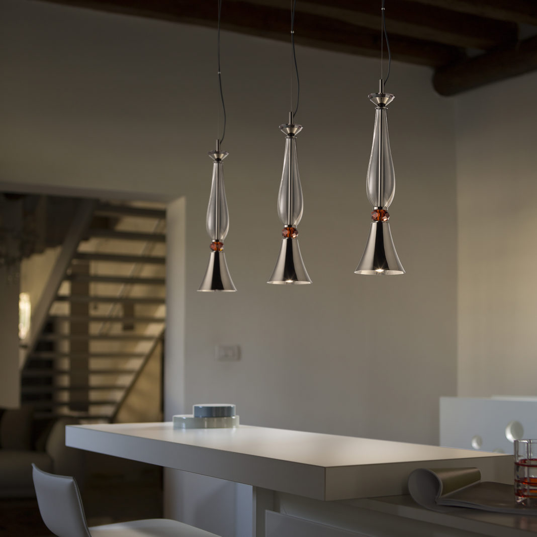 The Modern Pendant Light With Cut Crystal Detail is a striking decorative fixture, offering a downward light with an outstanding sparkle of crystal and glass. Perfect as standalone, and dazzling in clusters as shown. Distinctive, divine and timeless.