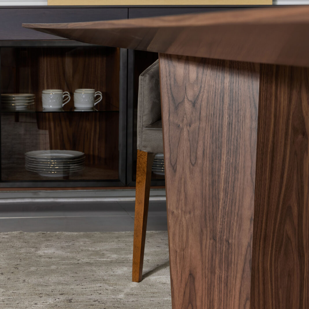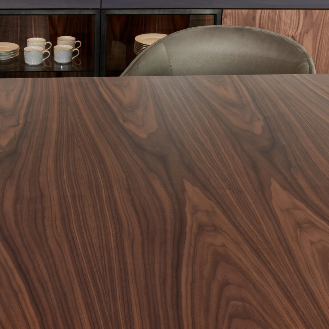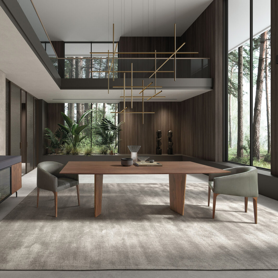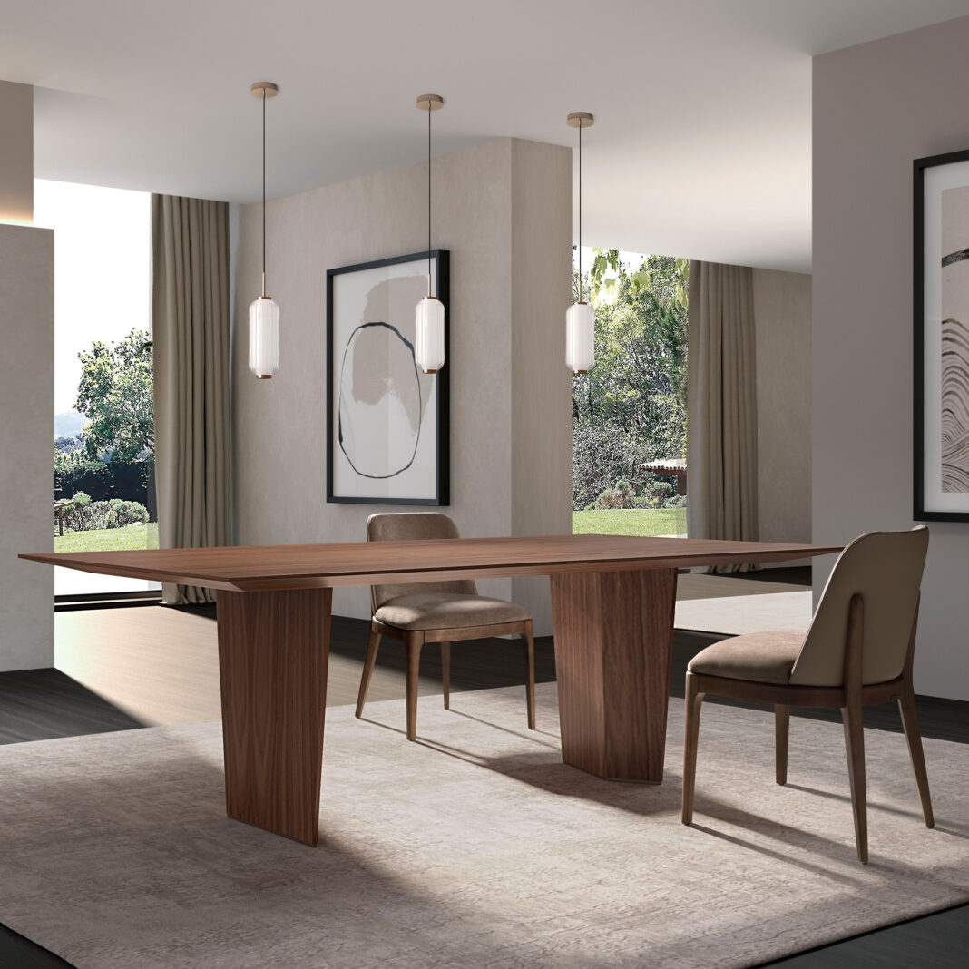 This statement dining table boasts stylish contemporary lines, finished in a matte walnut veneer. This is seamlessly complemented by sleek metal accents at the leg bases in a brass finish, adding a touch of contemporary style, ensuring stability and durability. In 2 sizes as standard, height 76 cm x width 240 cm x depth 110 cm and height 76 cm x width 300 cm x depth 110 cm. Also available in an extendable version (width 220 cm, extending to 320 cm), and a variety of wood veneers, lacquers and metal finishes by request. Prices will vary.