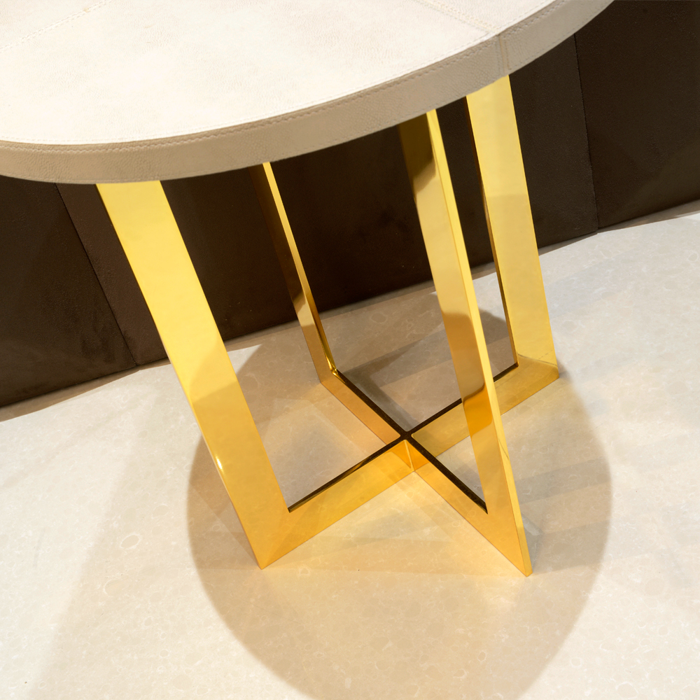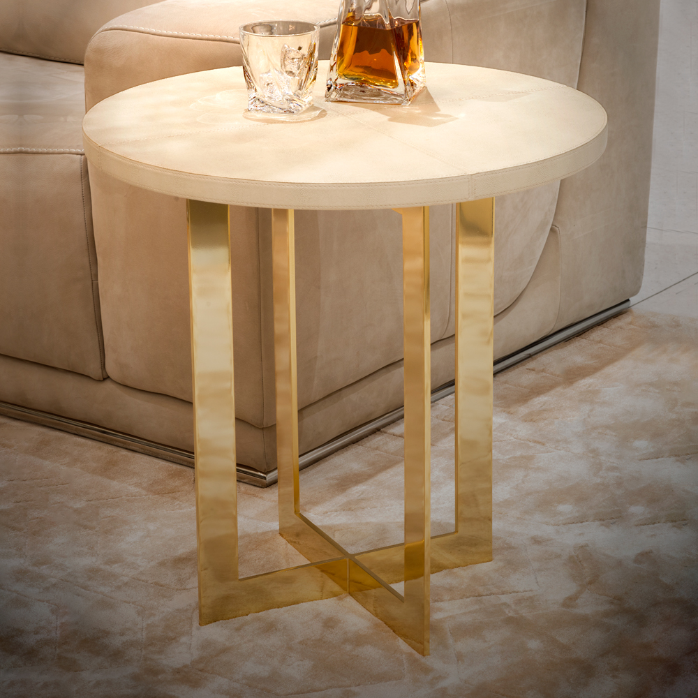 The fresh white textured leather top provides a luxurious backdrop for table lamps and home accessories. In contrast the contemporary styled stainless steel legs are dipped in 24 carat gold for the ultimate in luxury and glamour. As shown measures height 61 cm x diameter 50 cm.