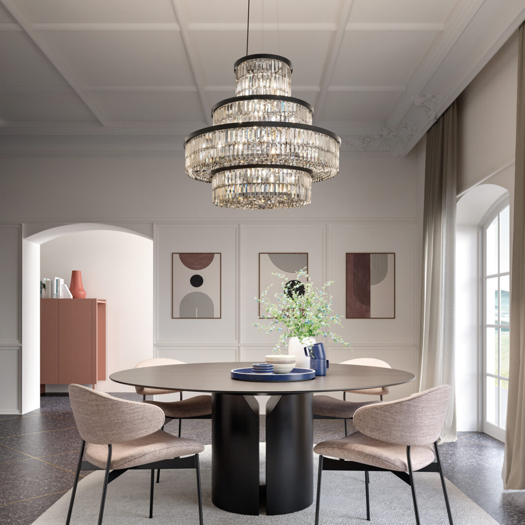Its matte black painted tiered metal frames, are adorned with faceted smokey golden cut crystal elements. Radiating a warm and inviting glow. Elevating any space with sophistication. Weight 29 kg – which requires 15 x E27 x 20 W max bulbs. Bulbs not included. Please note that bulbs for this style have a maximum diameter of 4.5 cm. Traditional lighting. Compatible with a TRIAC system, with dimmable bulbs only. Single canopy with a hanging chain of 150 cm as standard, that can be altered at installation stage. Available in custom sizes by request – prices will vary.