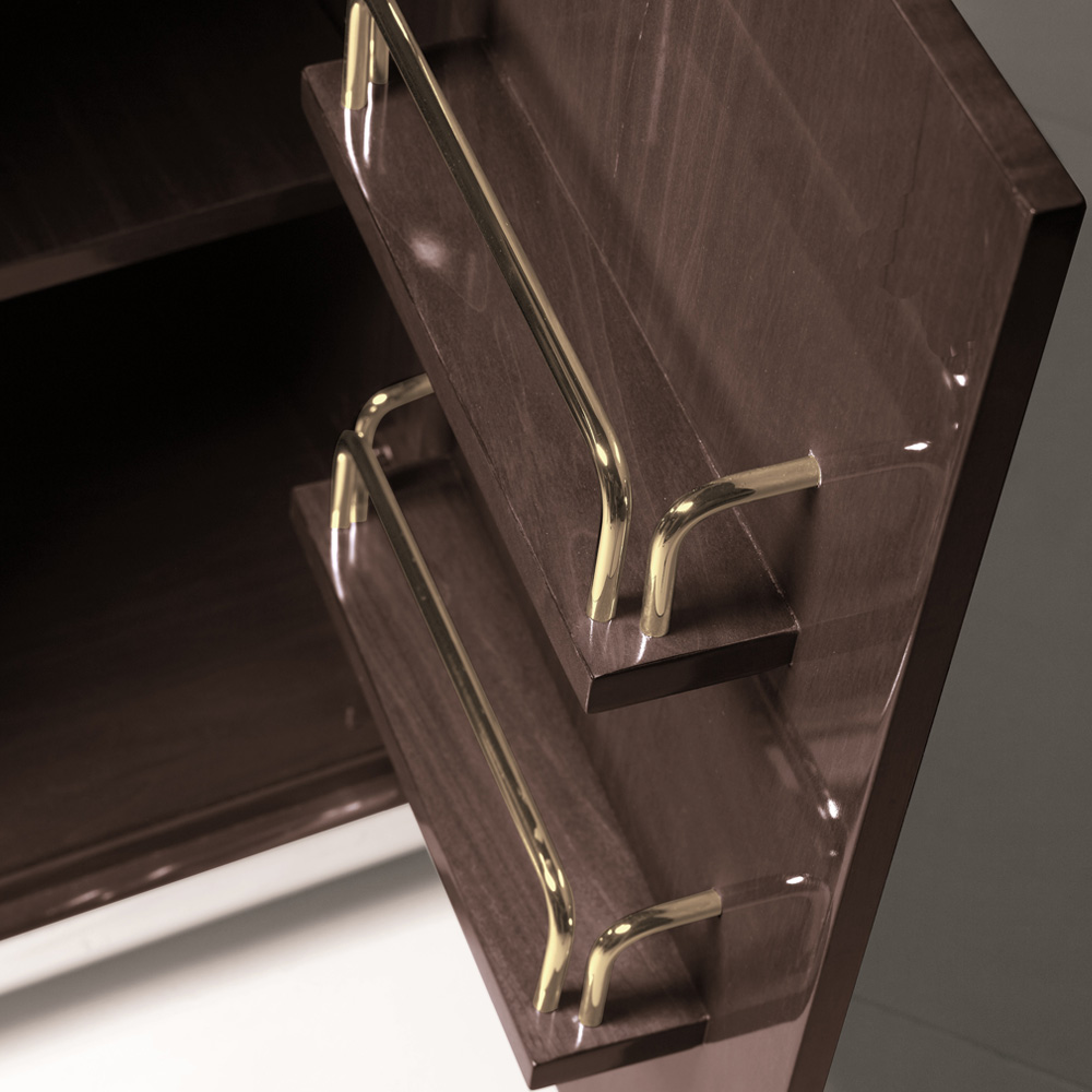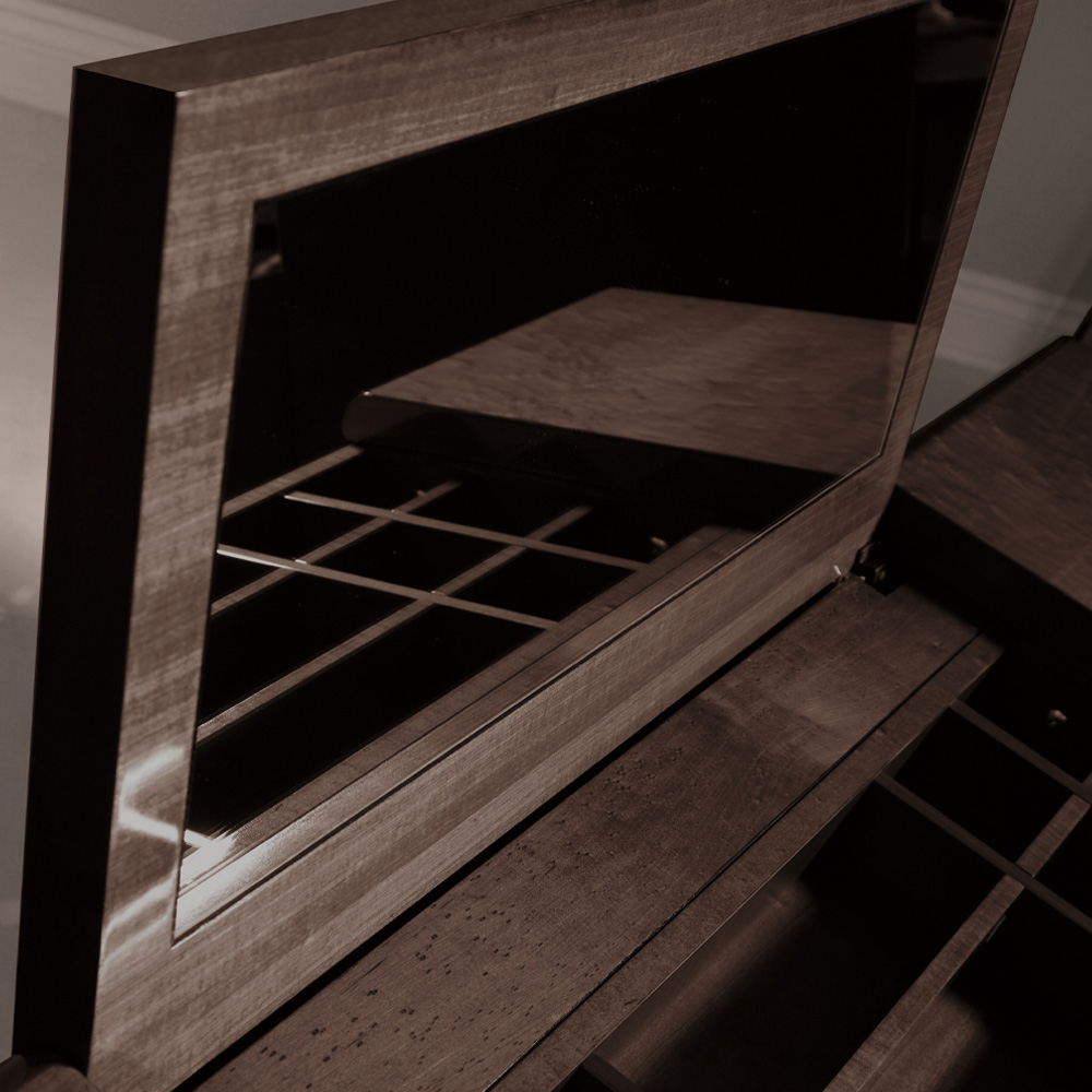 This chic unit features a high sheen dark rosewood finish, sublimely complemented by sleek brass accents. Complete with three drawers, two internal shelves, and additional internal storage. Opens to include an internal mirror. Available in a variety of finishes. Prices will vary.