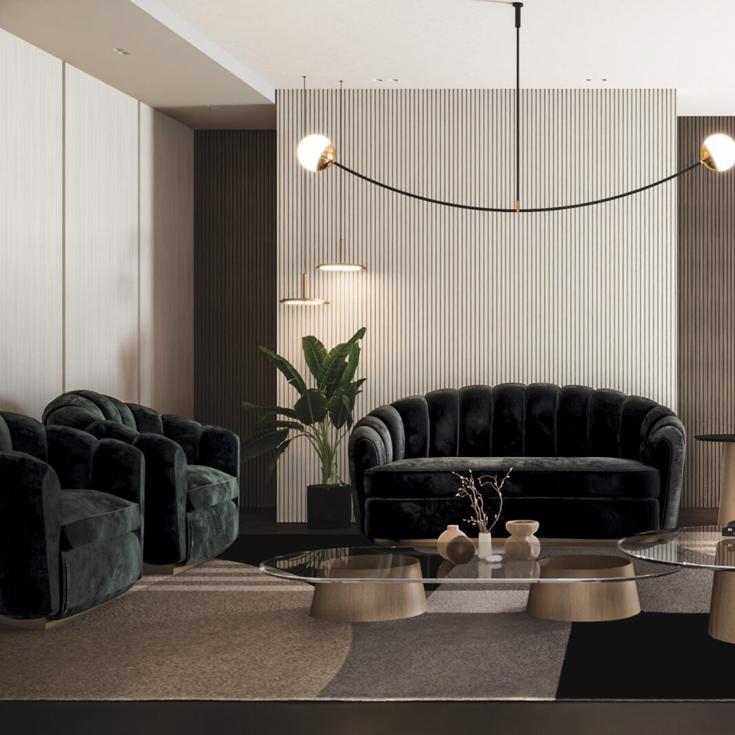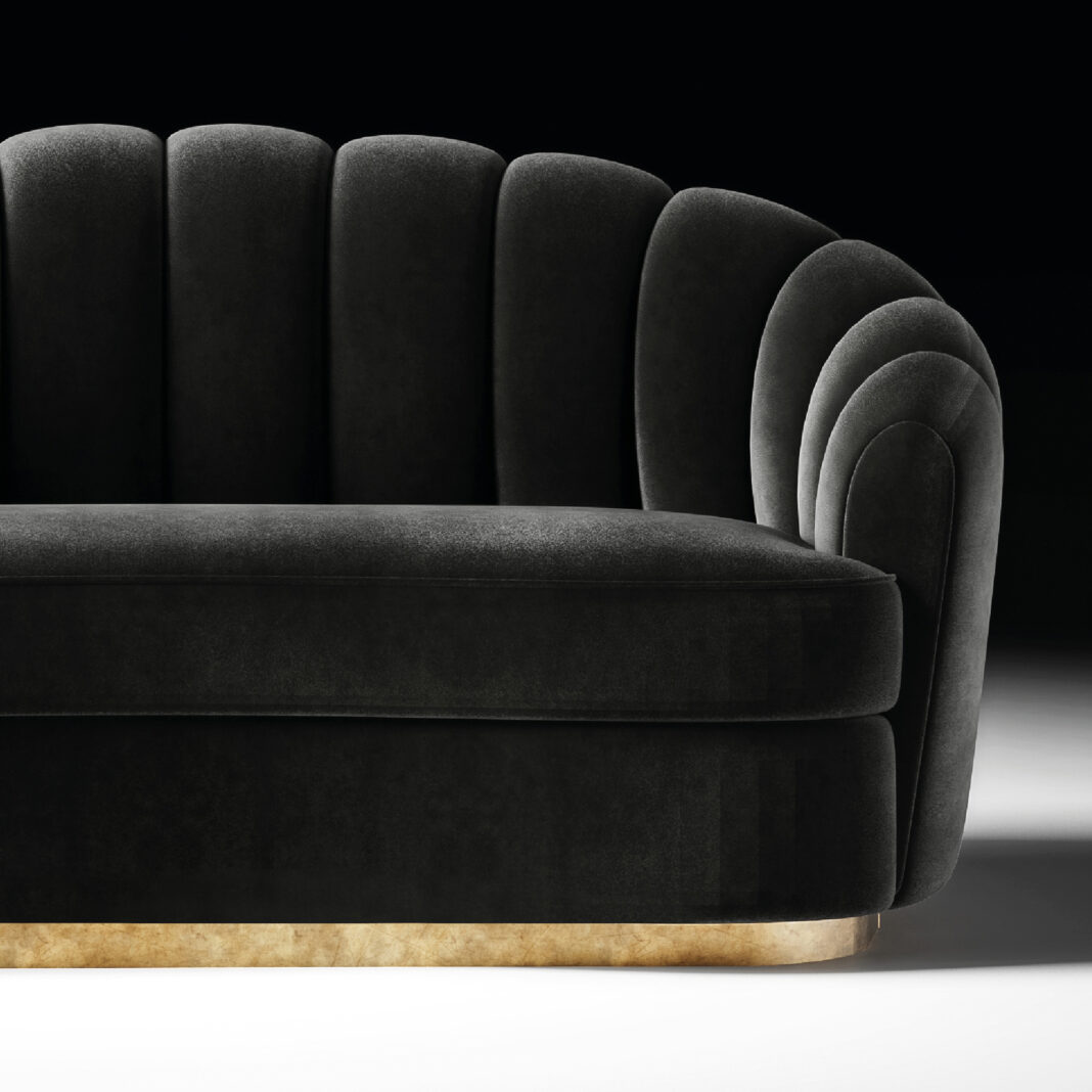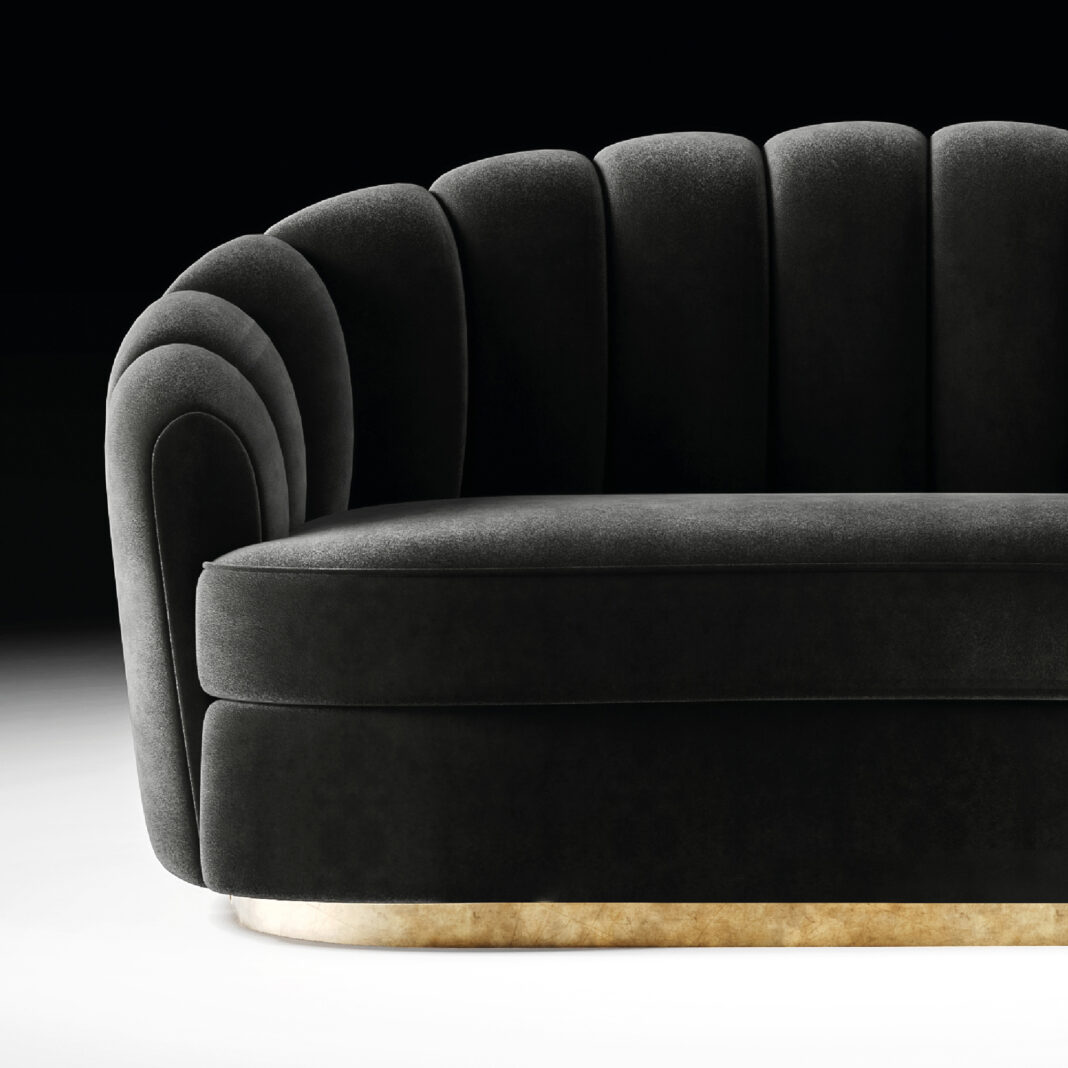 More than just a sofa, it stands as a complete work of art. Showcasing exceptional craftsmanship, a poplar wooden structure – padded in back density 35 – while seat density is 40. And upholstered to the highest standard in a luxurious black velvet fabric. Seat covers are removable. Resting on a contrasting 5 cm curved metal plinth is a lustrous gold finish. Exuding understated luxury.