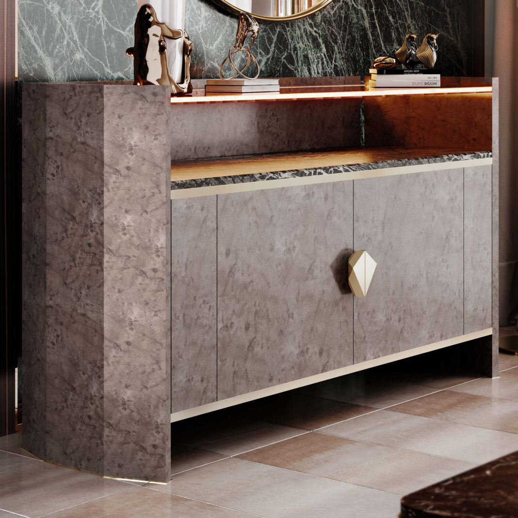 Drama and sophistication, a wooden structure in a fabulous bird eyes smoked root veneer finish – adding a unique and striking texture that catches the eye. Brass accents provide a warm and luxurious touch, while its tinted glass shelf reveals a versatile space that can be used to display or store items. The Kenya Black marble top exuding opulence and sophistication. Lighting is installed as standard, so will need to be near a power supply. The feature faceted ruby stone shaped brass handle completes the design, offering a beautiful standout, yet practical element. Various other veneers and finishes such as a matt, polished and brushed gold, brass, nickel, black nickel and matt or high gloss RAL lacquer colours are also available by request. Prices will vary.