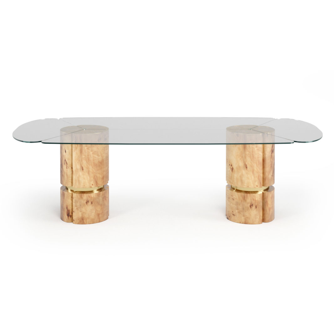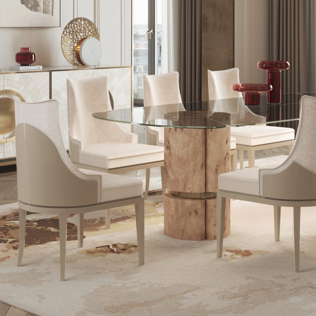 Hand-crafted with remarkable attention to detail by master craftsmen. An exquisite combination of Poplar Root Veneer and Polished Brass, finished in a high gloss varnish. Designed in a minimal contemporary style making the beautiful arrangement of radial organic clear glass its defining aspect. Creating a fabulous focus. Height 76 cm x width 260 cm x depth 120 cm. Weight 120 Kg. Paired beautifully with the charming beauty and exquisite opulence of the Art Deco Inspired Luxury Designer Two-Tone Dining Chair. Shown here in a high gloss lacquered finish, accentuating the feature curves and two-tone design detail. Padded and upholstered to the highest standards in a soft velvet fabric with satin piping detail. Creating a fabulous focus. Height 95 cm x width 55 cm x depth 60 cm. Weight 21 Kg. Available to order in various sizes and finishes by request. Prices will vary.