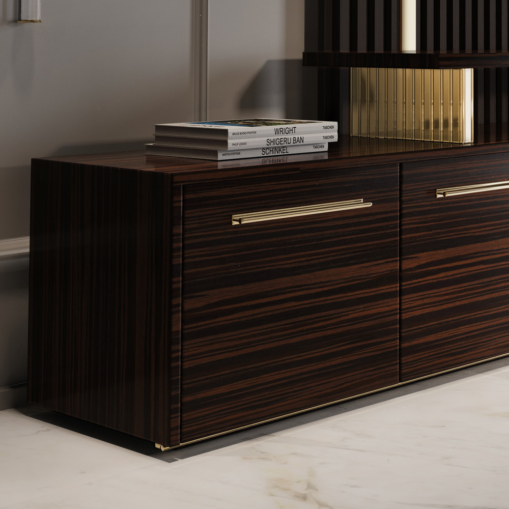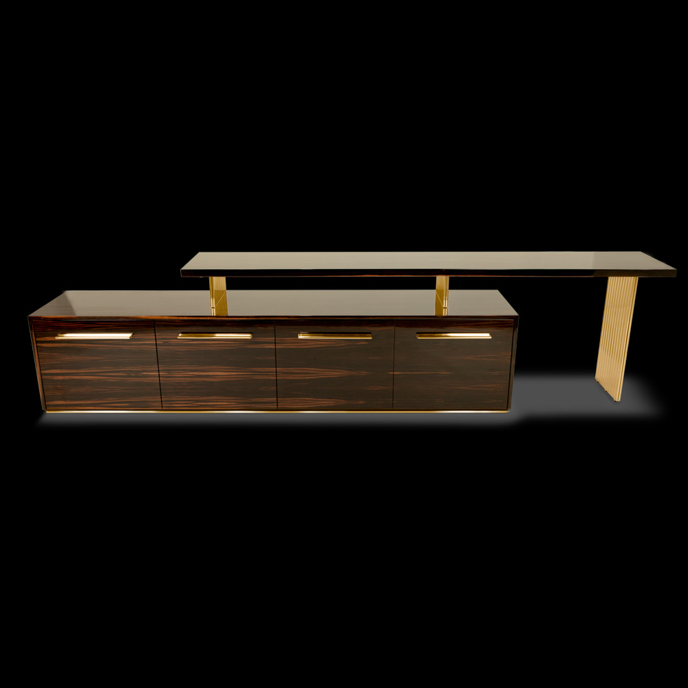 The perfect union of materials, a harmony of forms with statement Bauhaus inspired styling from the 1910 to 30’s period. Featuring functional shapes, and balanced asymmetry by design, with bold materials such as brass in a polished 24 carat gold finish, high gloss Ebony veneer and glass. For each comportment of this modern tv unit, you can find a double shelf, separated by a mirror feature. Creating a truly fabulous focus. Various other veneer finishes and metal finishes such as a matt, polished and brushed gold, brass, nickel, black nickel and copper are also available by request. Prices may vary. Please note that the television is not included.