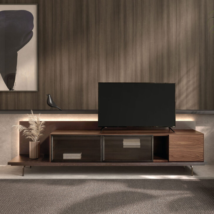 The Modern Walnut Veneer TV Cabinet proves that media furniture can be both functional and beautifully designed, adding flair and imagination to any interior. With ample storage for all your media and TV equipment, this piece combines practicality with contemporary elegance. The LED-backlit panel enhances its refined detailing, creating a luxurious ambiance and making it a stunning focal point for modern living spaces.