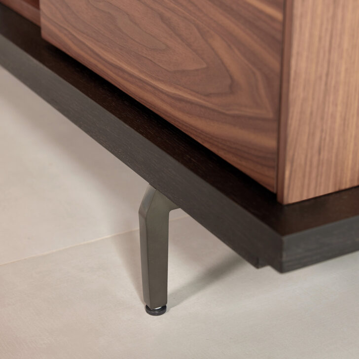This luxurious media unit features a sumptuous combination of matte walnut and black oak veneer with black nickel metal finishes. Exquisitely complemented by 2 smoked glass downward opening doors with metal frames, 2 practical drawers, 2 glass shelves and an open compartment – allowing for a generous amount of storage space. Equipped with dimmable 4000K LED lighting elegantly integrated around the rear edge. Also available in a variety of wood veneer, lacquered and metal finishes by request. Prices will vary.