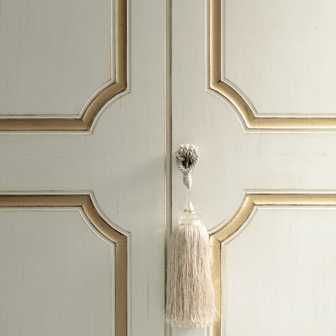 Creating the most striking of outlines, a 2 door wardrobe beautifully detailed in a unique white, together with beautiful antiqued hand painted accents of gold. A subtle lockable key releases the doors. Ornate carved details, are accentuated and flow through to complete the design. Internal configuration as shown, shelving to top level, hanging rail, and drawers to the lower level. Tassel not included. Also available in various sizes and finishes by request.