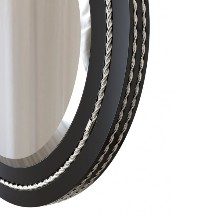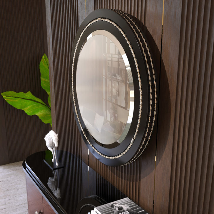 The Nautical Round Mirror is simply exquisite. Of nautical inspiration, this remarkable piece makes a stunning statement for any living space. Inviting you on the adventure of a lifetime. Impeccably executed by the most beautiful of craftsmanship. Its combination of bold lines and exquisite materials adds a touch of sophistication to both classic and contemporary interiors. This elegant design would serve as a glamorous welcome in a hallway, or a luxurious focus in a dining room or lounge for luxurious and exclusive interior decors. Beautiful paired with the Oval Veneered Sideboard as shown.
