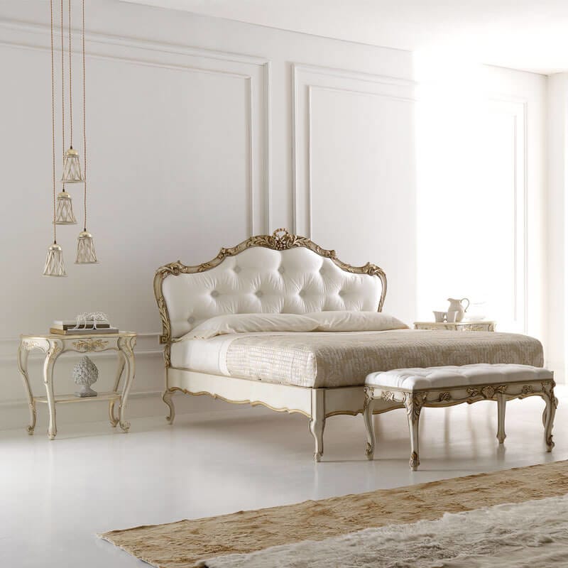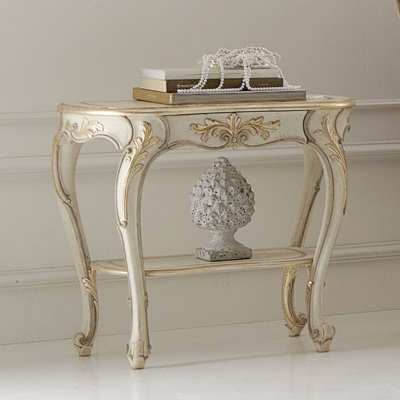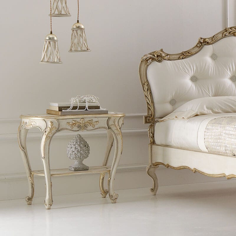 The Opulent Carved Italian Bedside Table with hidden drawer and lower shelf. A beautiful addition to any bedroom, but also as perfect as a side table by a sofa or in a hallway. Truly versatile. Shown here in an antiqued ivory finish together with hand painted champagne gold detailing to the ornate carved frame. Height 66 cm x width 72 cm x depth 39 cm. Alternative frame colours and finishes also available. This bedside table is shown here as part of a bedroom set, also pictured. Made to highest standards. Allow 12 weeks for dispatch. The subtle finishes of the unique Florence Collection with every detail designed to be exclusive.