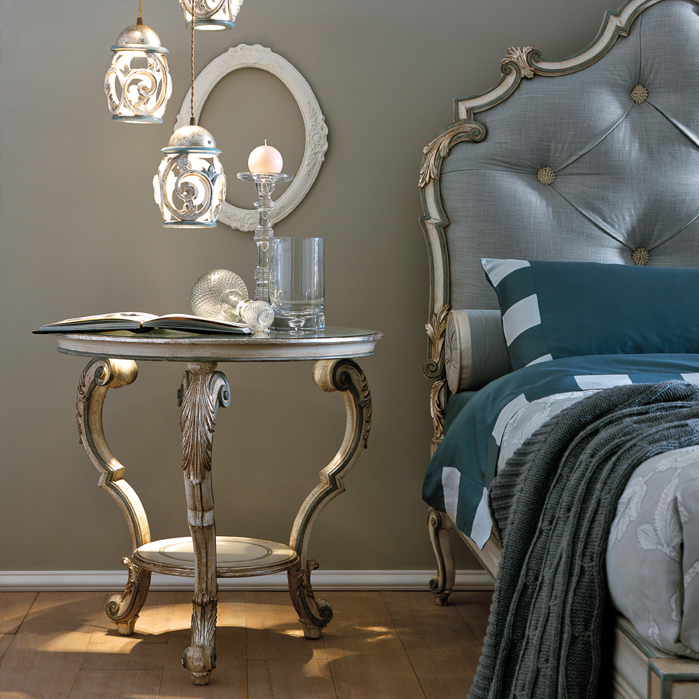 The Opulent Carved Reproduction Rococo Round Bedside Table with lower shelf. Exquisite curves define this piece, creating a dramatic statement indeed. A beautiful addition to any bedroom, but also as perfect as a side table by a sofa or as a welcome in a hallway. Truly versatile. Shown here in an antique white finish together with hand painted antiqued silver and a regal dusky blue defining lines of the carved detailing of the ornate frame. Height 73 cm x diameter 70 cm. Alternative frame colours and finishes are also available too. Prices will vary. This bedside table is shown here as part of a bedroom set, also pictured. Made to highest standards. Allow 12 weeks for dispatch. The subtle finishes of the unique Florence Collection with every detail designed to be exclusive.