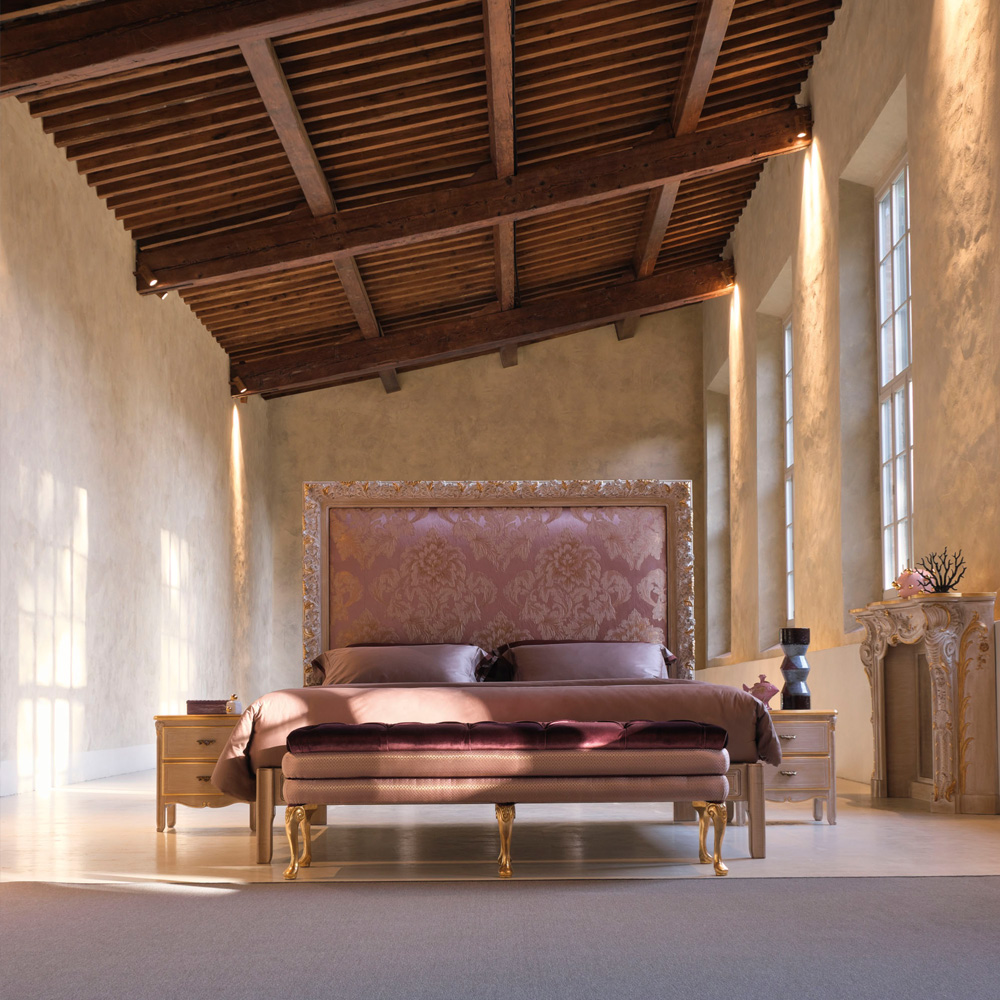 Superbly executed by master Italian craftsmen this design is outstanding in its use of luxury materials and attention to detail. The headboard and base are finished in a luxurious in a two-tone cerused wood finish with accents of gold, making its intricate carvings its defining aspect. The headboard is then padded and sumptuously upholstered in the most beautiful pink, ivory and gold damask linen mix fabric. Height 180 cm x width 187 cm x depth 210 cm to fit a 180 cm x 200 cm mattress, and height 180 cm x width 207 cm x depth 210 cm to fit a 200 cm x 200 cm mattress. Other sizes are available to order with alternative fabrics and leather, including customers own fabric, frame colours and finishes and also the option to have standard upholstery, or as a headboard only. Prices will vary. Includes headboard, base and slats.