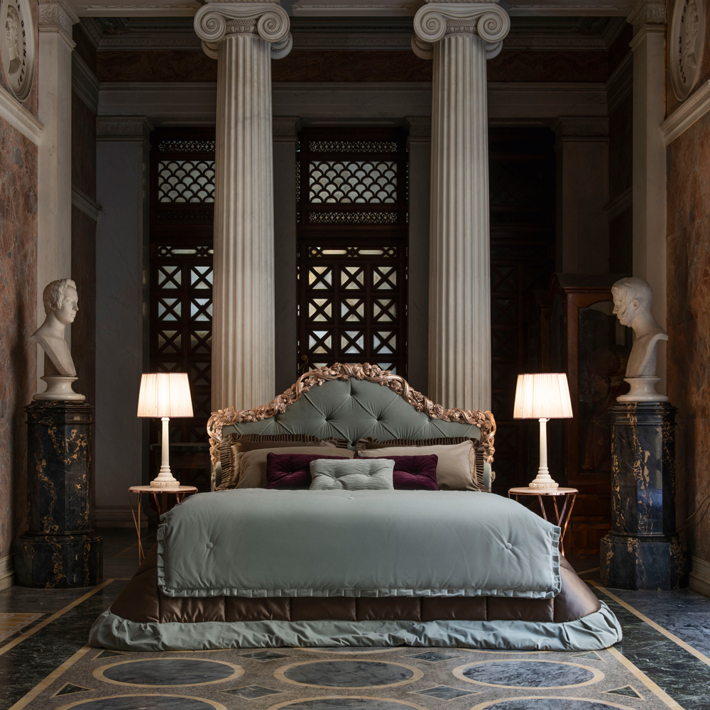 Superbly executed by master Italian craftsmen these designs are outstanding in their use of luxury materials and attention to detail. The headboard and base are finished in a luxurious rich gold, accentuating the exquisite carved detailing. The headboard is then padded and sumptuously button upholstered in an opulent green velvet fabric. Offering a dramatic focus. Height 155 cm x width 192 cm x length 209 cm to fit a 180 cm x 200 cm mattress, height 151 cm x width 211 cm x length 209 cm to fit a 200 cm x 200 cm mattress and height 139 cm x width 130 cm x length 209 cm to fit a 200 cm x 200 cm mattress. Other sizes are available to order with alternative fabrics and leather, including customers own fabric, frame colours and finishes. Prices will vary. Includes headboard, base and slats.