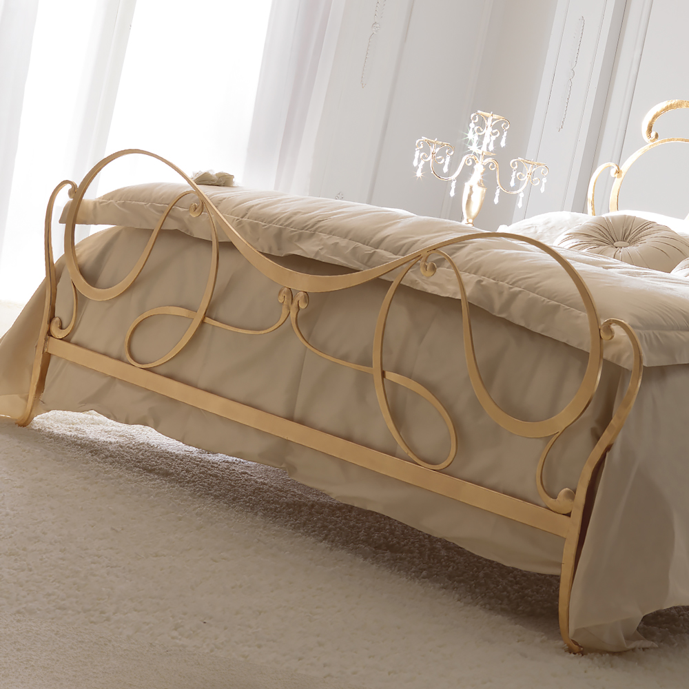 Shown here with a gold leaf finish to the elaborate iron swirls of the headboard and footboard. Overall height is 159 cm, footboard height is 73 cm. Dimensions to fit the standard 165cm x 190 cm mattress, bed width 185 cm x length 204 cm. Overall width an additional 20 cm to mattress size and overall length an additional 14 cm to mattress size. Available to fit mattress sizes as shown. Alternative finishes, frame colours and special sizes available on request. Prices vary. Available without footboard if required. Throws, linen, cushions and bolster cushions sold separately.