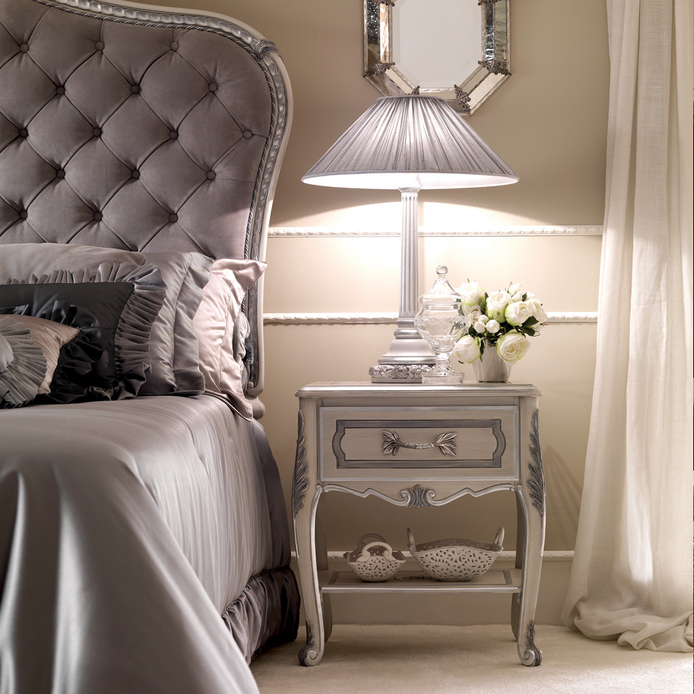 The Ornate Italian Bedside Table with beautiful feather detailing is shown here in finished by artisans in a luxurious painted silver, grey and blue with a wooden top. Height 63 cm x width 57 cm x depth 44 cm. Also available to order in different colours, finishes and with a marble or protective tempered glass top. Prices will vary.