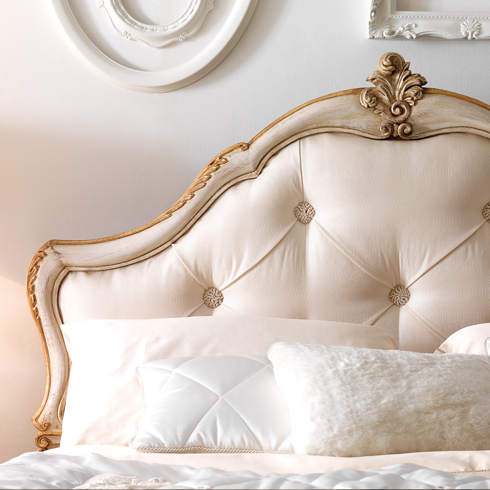 The Ornate Italian Button Upholstered Bed is a beautiful addition to any bedroom, shown here in oyster linen button upholstery with an antiqued ivory finish with hand painted gold detailing to the ornate carved frame. Height 158 cm x width 183 cm x length 209 cm, for mattress size – width 170 cm x length 200 cm. Therefore the overall dimensions are 13 cm wider and 9 cm longer than the mattress size of choice. Alternative frame colours, finishes, fabrics as well as customers own and special sizes also available too. Prices will vary.