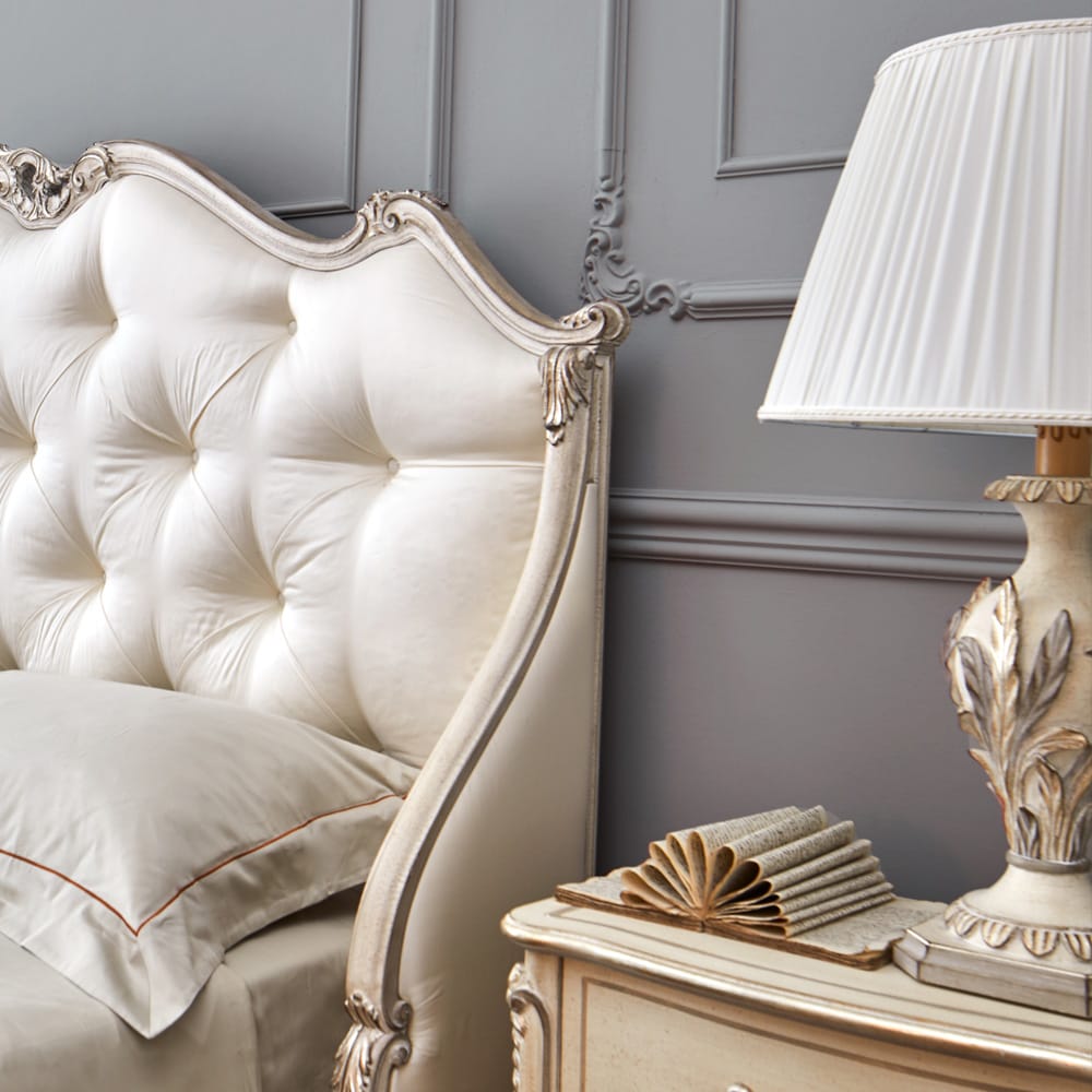 This lamp is part of a bedroom set, also pictured and available. Please allow 12 weeks for dispatch. Superbly made by the very best artisan Italian manufacturers, this range is made wholly in wood, and distinguished in every detail by hand. Finished with water-based paints together with warm metallic accents, then coated with natural oils and waxes, altogether creating an environmentally friendly finish. These subtle finishes are unique to the Florence Collection and designed to be exclusive.