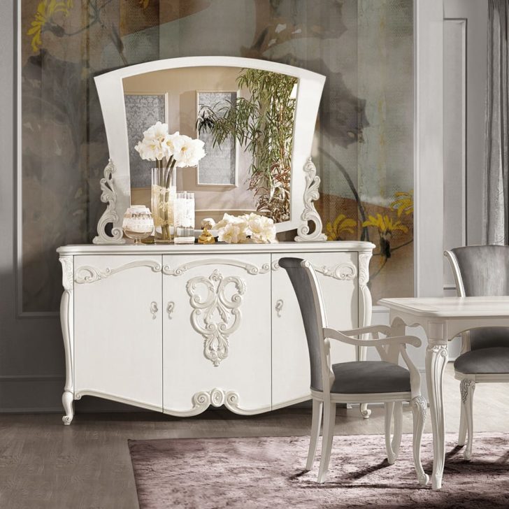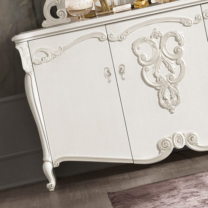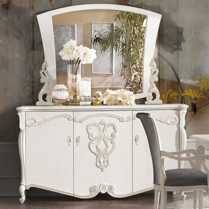 The Ornate Italian Designer Three Door Sideboard And Mirror Set is carved from solid wood and shown here in a vibrant white painted finish accentuating the carved details, handles and embellishments. A stylish yet versatile combination which adds the utmost in glamour to any setting. Sideboard height 103 cm x width 187 cm x depth 54 cm. Weight 130 kg. Paired here with the perfectly complementary Ornate Italian Designer Table Top Mirror offering an elaborate curved silhouette, in a matching finish and height 123 cm x width 142 cm x depth 2.5 cm. Weight 25 kg. Alternative sizes and finishes are available on request, prices may vary. Available separately or as a set as shown.