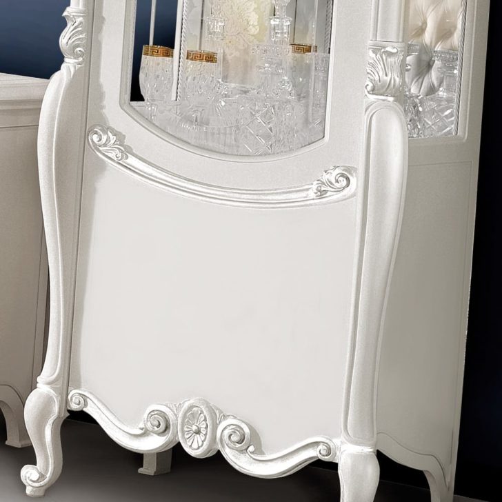 The Ornate Italian Designer TV Unit And Display Cabinet Set is carved from solid wood and shown here in a vibrant white painted finish accentuating the carved details, handles and embellishments. A stylish yet versatile combination which adds the utmost in glamour to any setting. The low Ornate Italian Designer TV Unit with engraved glass central storage area and two concealed cabinet storage compartments is height 71 cm x width 187 cm x depth 54 cm. Weight 105 kg. Paired here with the perfectly complementary single door Ornate Italian Designer Display Cabinet, featuring engraved glass door panels with an internal lighting kit as standard, offering a fabulous storage solution. In a matching finish and height 217 cm x width 85 cm x depth 57 cm. Weight 90 kg. Alternative sizes and finishes are available on request, prices may vary. Available separately or as a set as shown.