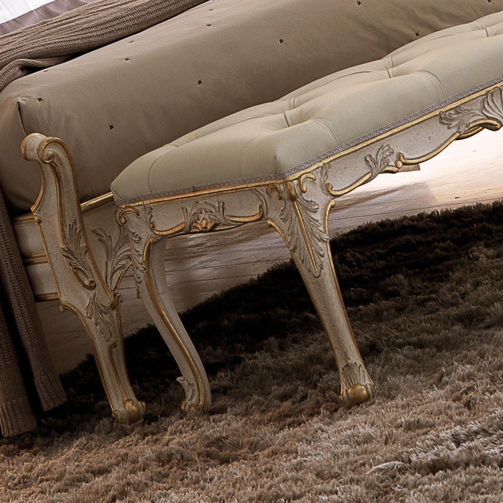 The Ornate Italian Leather Button Upholstered Bench, rococo in style and a statement addition to any room in the house. As comfortable at the end of the bed as it is under a window or as a welcome in a hallway. Above all striking in any setting, truly versatile. Shown here in an antiqued ivory finish, together with beautiful antiqued hand painted accents of gold to the ornate carved detailing of the frame. Completed in pure contrast in the finest warm ivory Italian leather button upholstery. Height 46 cm x width 100 cm x depth 48 cm. Alternative fabrics, finishes and sizes are also an option. Prices vary. This bench is part of a bedroom set, also pictured and available. Made to highest standards. Please allow 12 weeks for dispatch.