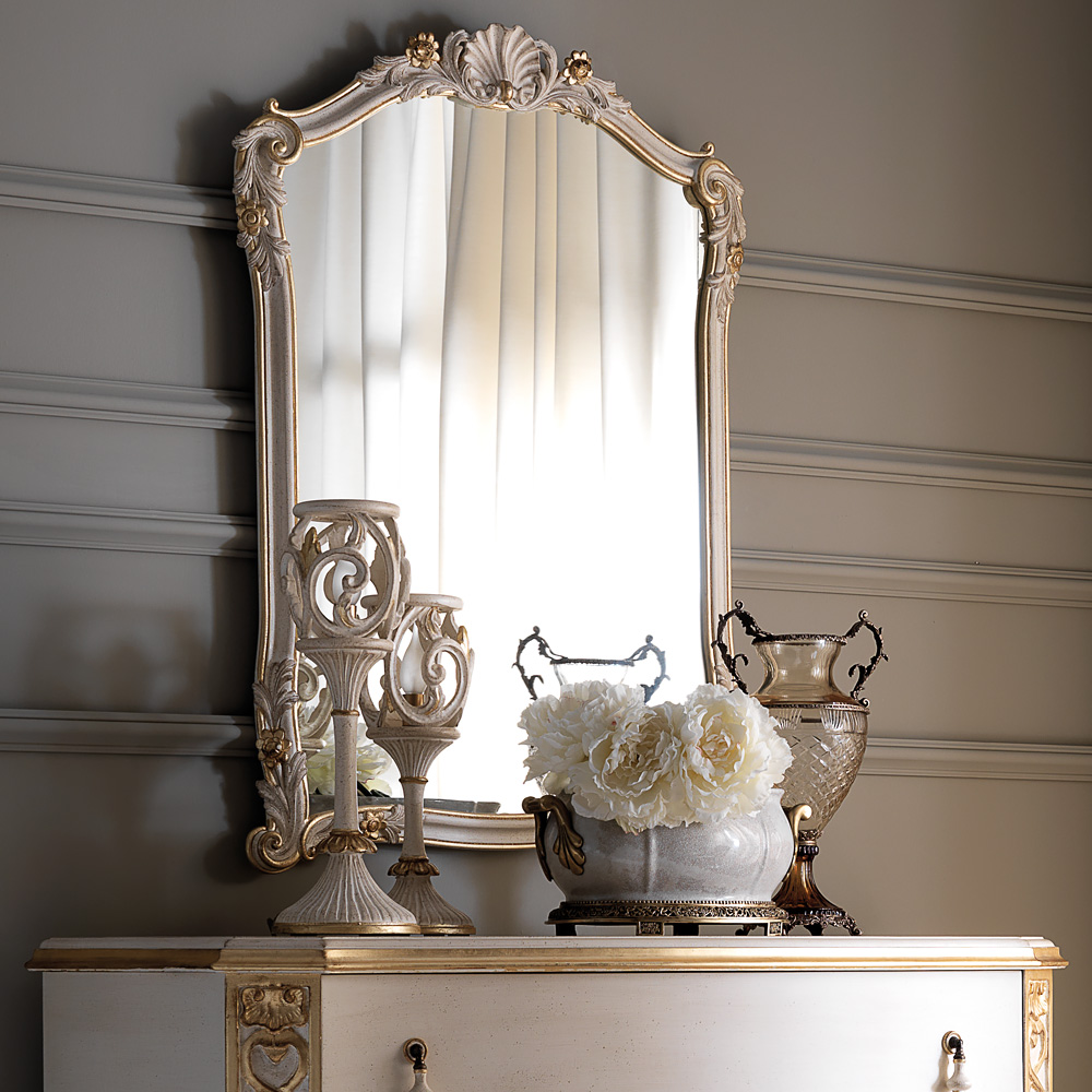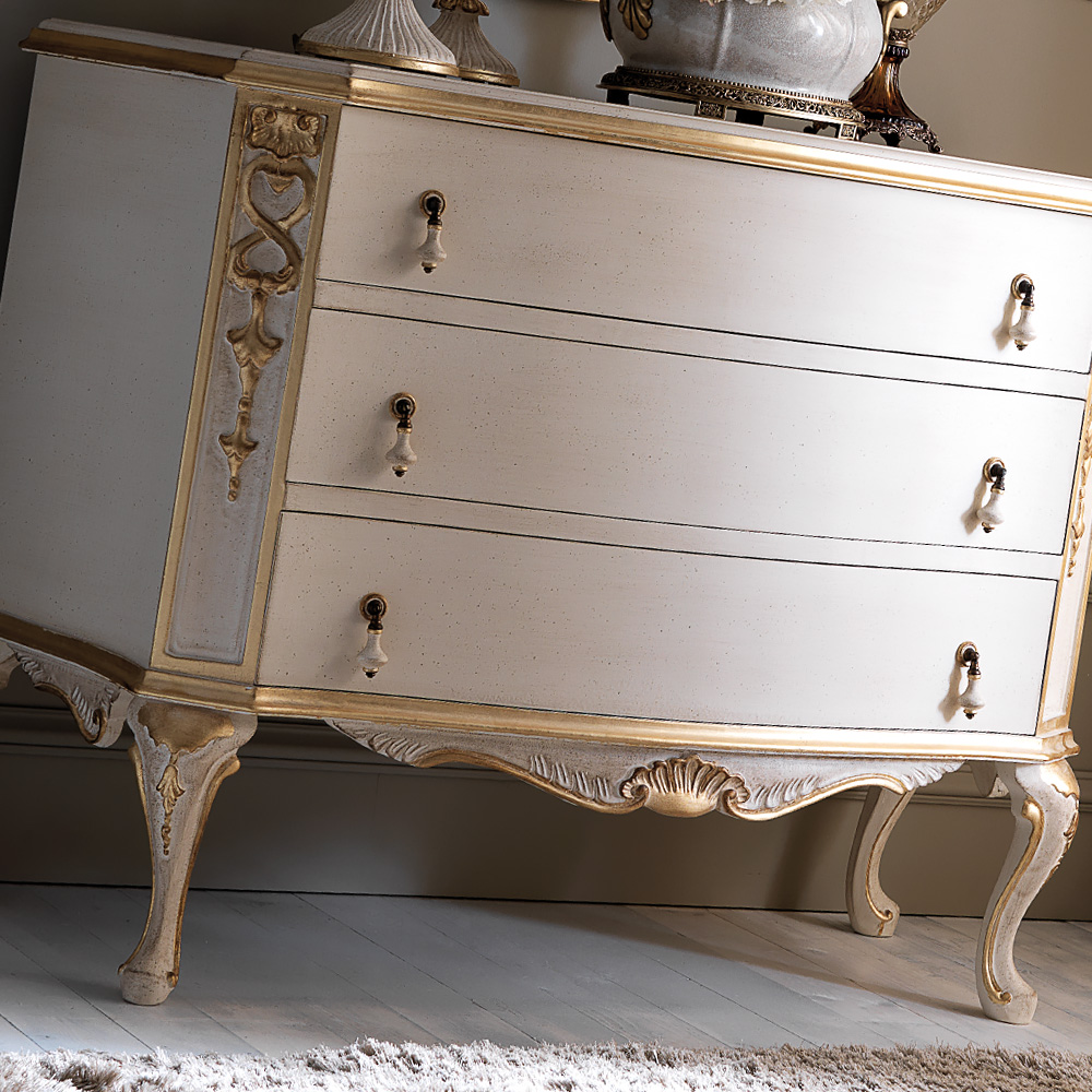 The Ornate Italian Rococo Chest of Drawers and Mirror Set is the most striking addition to any setting. A statement pairing for any room in the house, as comfortable in the bedroom as it is as a welcome in a hallway. Above all, truly versatile. Shown here in an antiqued ivory finish together with hand painted antiqued gold to the carved detailing of both the chest of drawers and the beautiful mirror which completes the set. Embellished with unique delicate handle fittings with tear drop ceramic pulls. The drawers have an integrated soft close blumotion system for effortless closing and added luxury. Chest of drawers, height 87 cm x width 128 cm x depth 56 cm. Mirror, height 100 cm x width 72 cm. Alternative frame colours, sizes, finishes and various handle styles are also available. Available as a set as shown, or separately. Made to highest standards. Allow 12 weeks for dispatch.