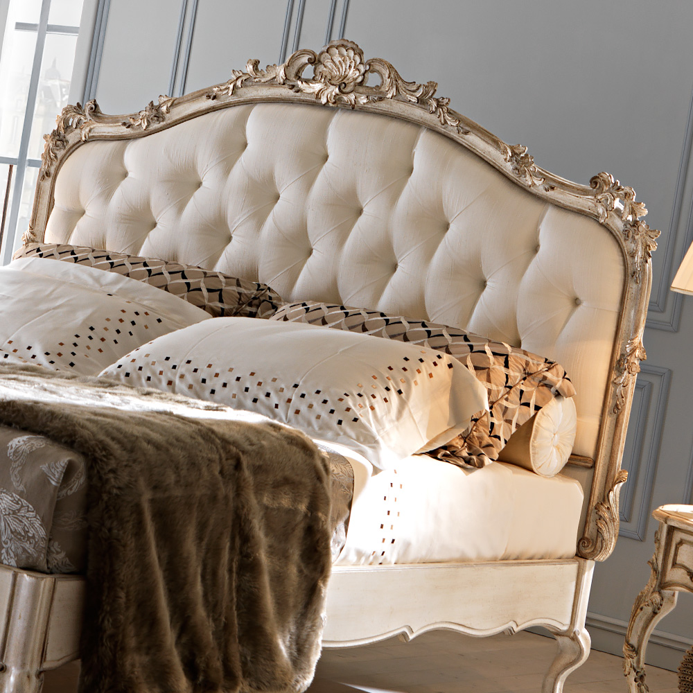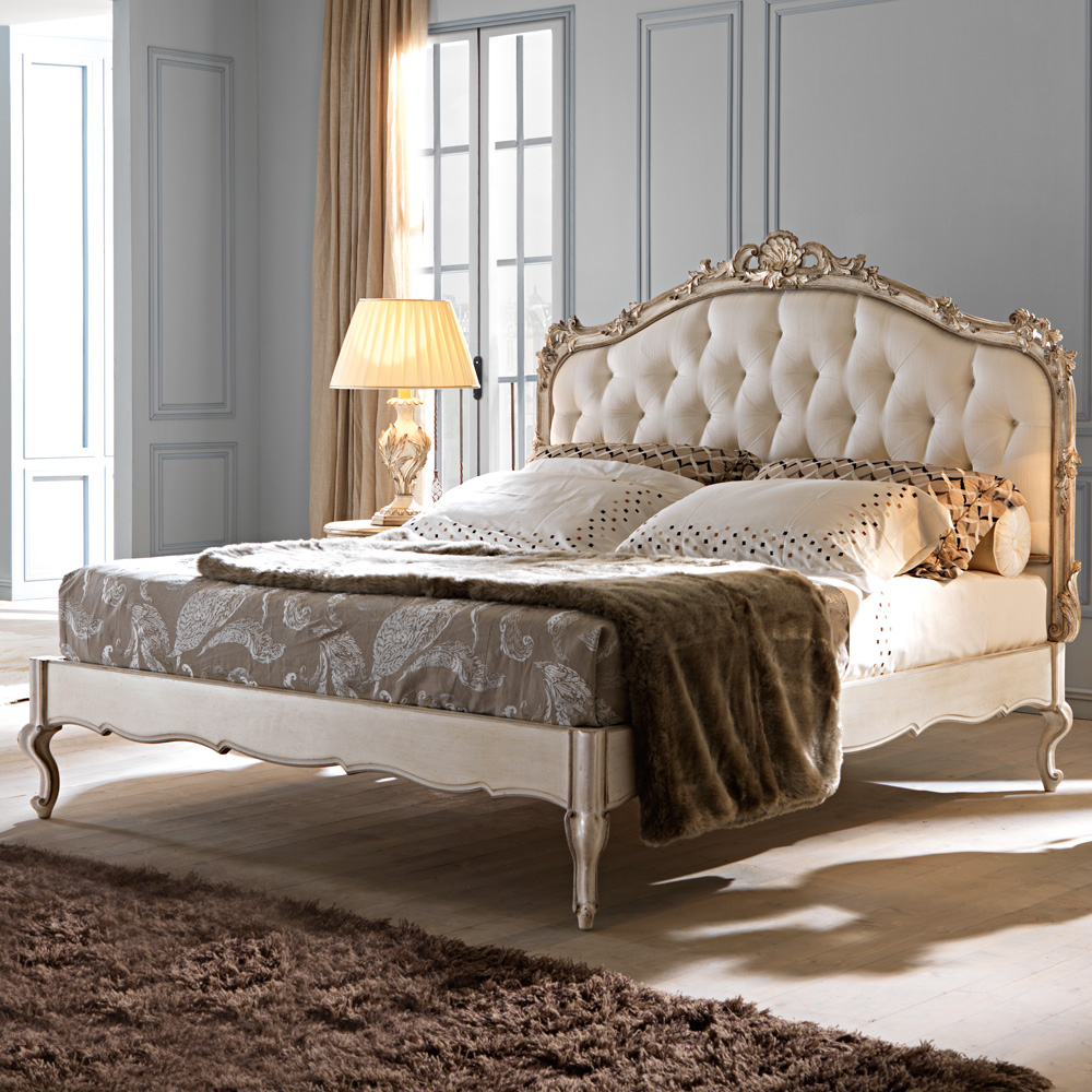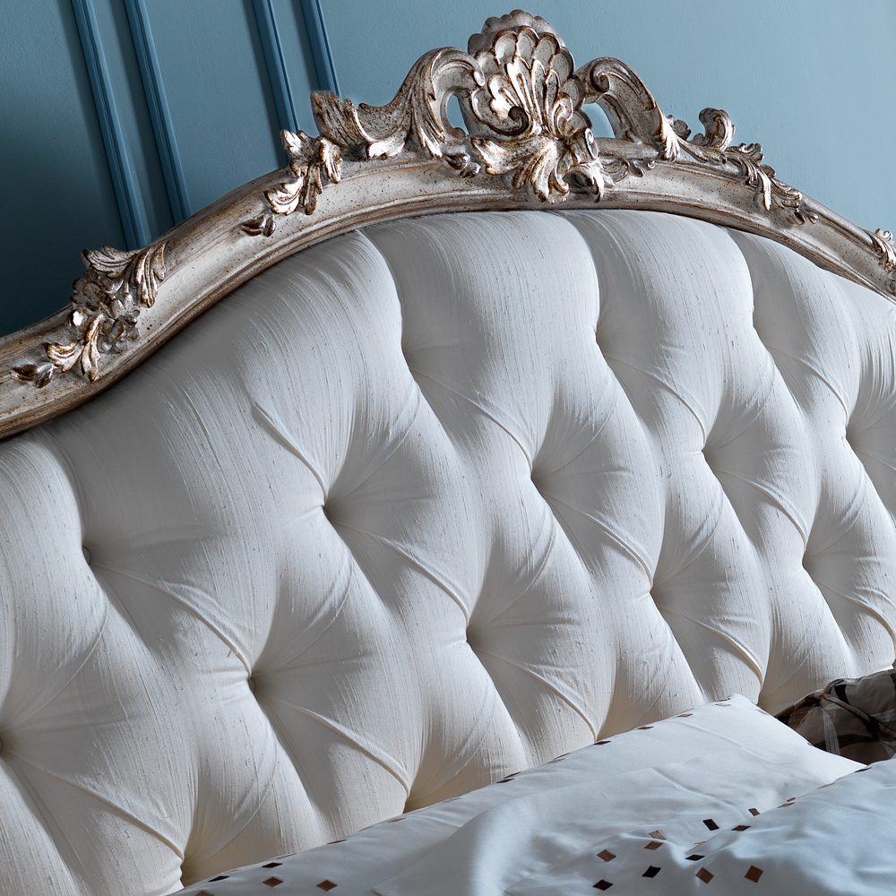 The Ornate Italian Rococo Reproduction Button Upholstered Bed, sophisticated style. A true classic statement. The most beautiful addition to any bedroom interior, above all adding elegance and glamour to any setting. Shown here in an antique white finish together with hand painted antiqued silver and ash to the carved detailing of the headboard and base. Creating a dramatic effect. Completed in contrast with button upholstery to the highest standards in the finest warm ivory silk. Height 155 cm x width 192 cm x length 215 cm, for mattress size width 170 cm x length 200 cm. Therefore the overall dimensions are 22 cm wider and 15 cm longer than the mattress size of choice. Alternative frame colours, finishes and special sizes are also available on request. Prices will vary.