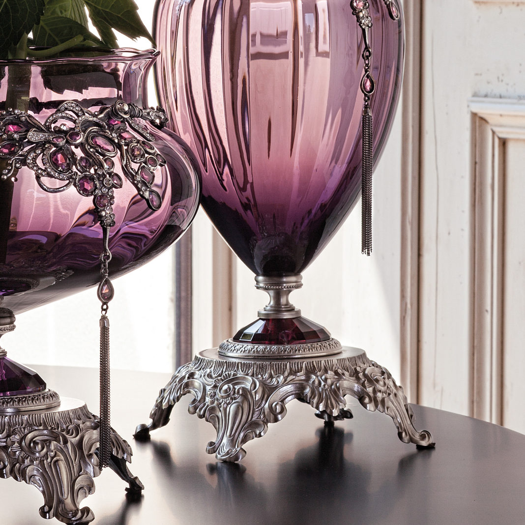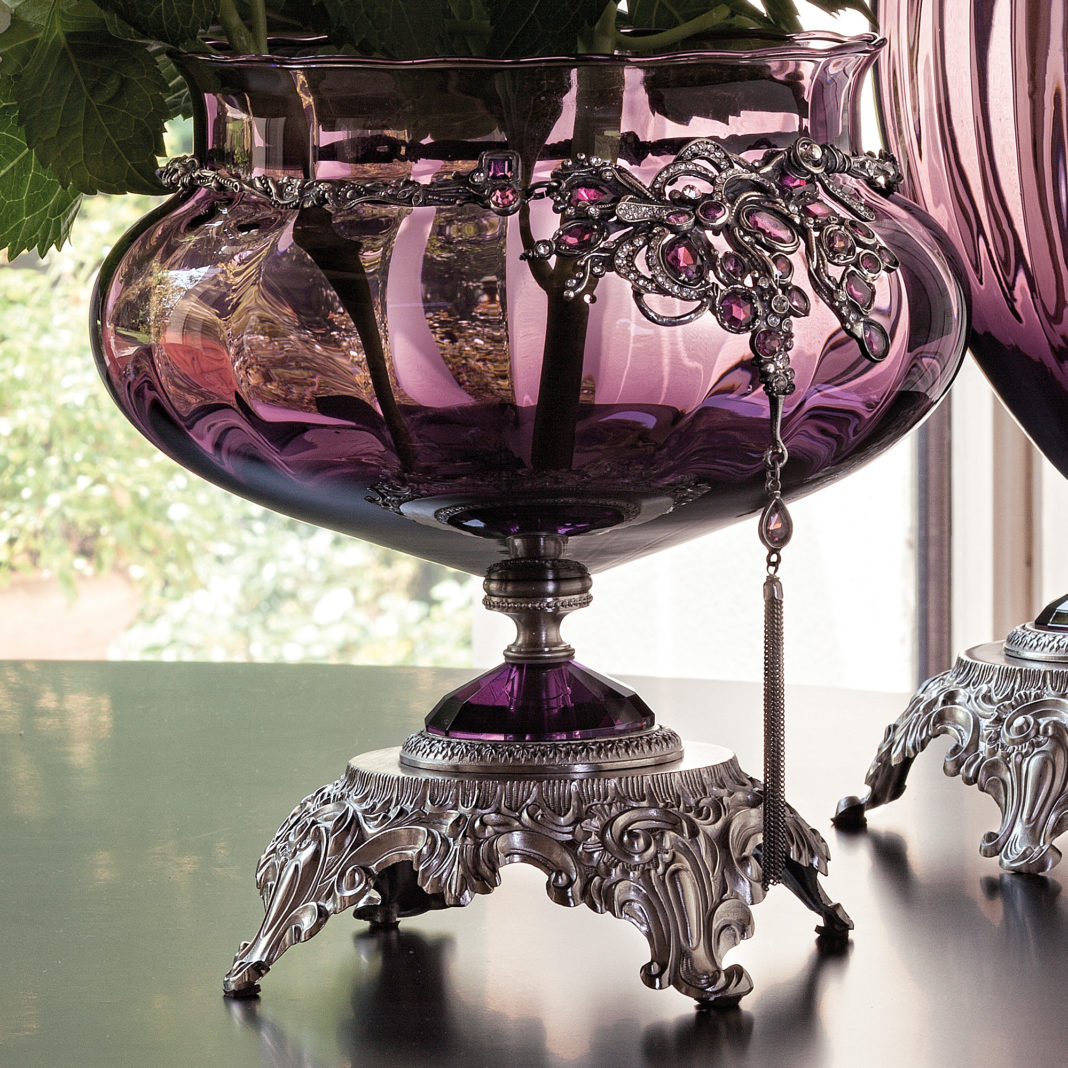 Beautifully detailed ornate brass structures with shimmering faceted glass detail, in a satin silver finish. Supporting elegantly shaped bodies of amethyst glass hand blown in Tuscany. Adorned with exquisite handmade decorative necklaces in an antique silver finish with rich stone detail and feature tassels. In 2 styles as standard. Vase, height 43 cm x diameter 23 cm – weight 2.5 kg and centrepiece style bowl at height 28 cm x diameter 26 cm – weight 2.5 kg. Available in a satin gold finish and glass colours such as amber, ruby and smoked by request. Prices will vary.
