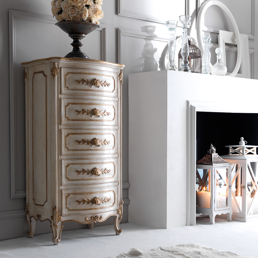 The Ornate Rococo Italian Tall Boy Drawers with five drawers is a beautiful addition to any bedroom. Also perfect as a glamorous statement chest of drawers in any setting, the ultimate in stylish storage solutions. Truly versatile. Shown here in an antiqued ivory finish, together with beautiful antiqued hand painted accents of gold to the ornate carved detailing which also creates striking unique handles. The drawers have an integrated soft close blumotion system for effortless closing and added luxury. Height 124 cm x width 65 cm x depth 47 cm. Alternative frame colours and finishes also available. This tall boy is part of a bedroom set, also available. Made to highest standards. Allow 12 weeks for dispatch. The subtle finishes of the unique Florence Collection with every detail designed to be exclusive.