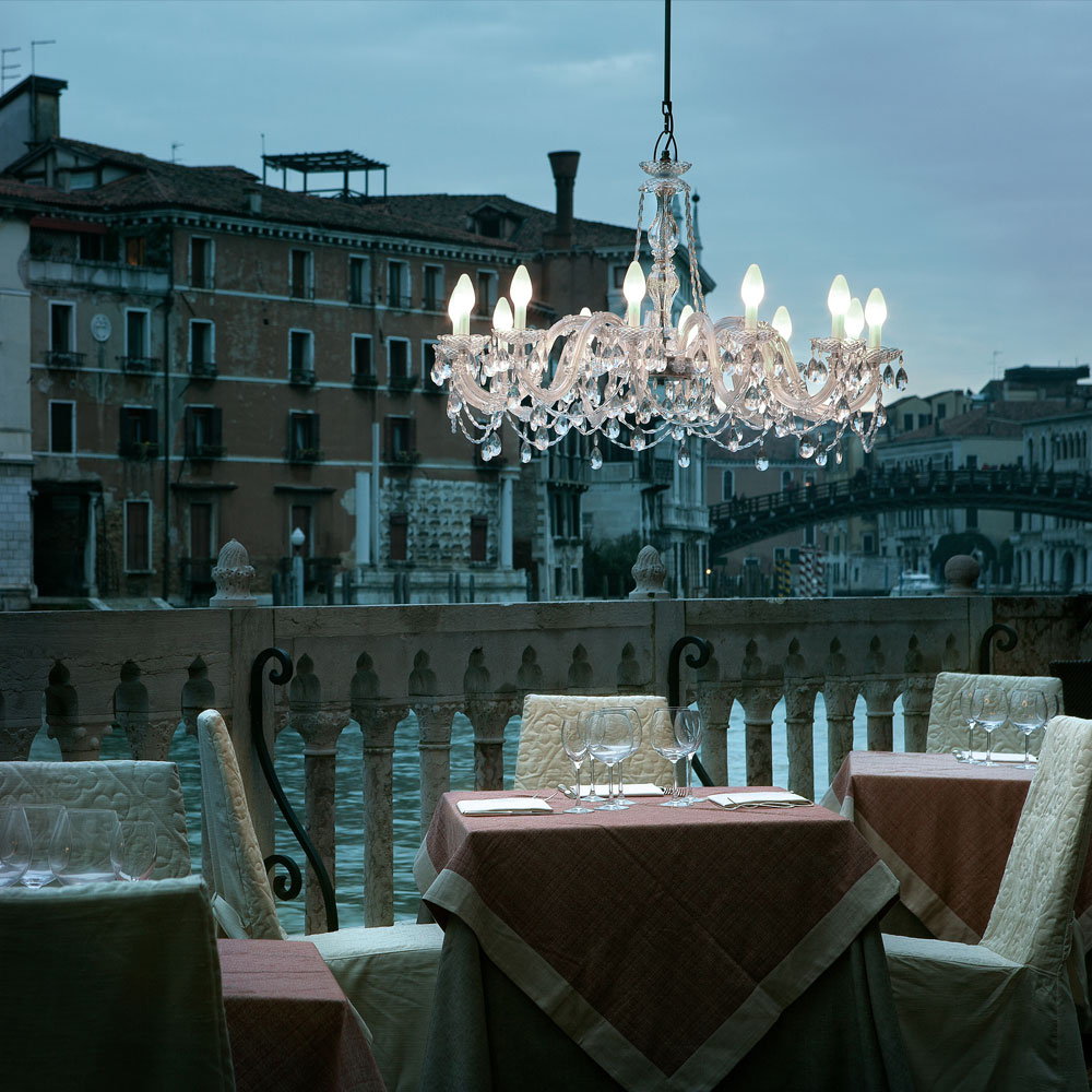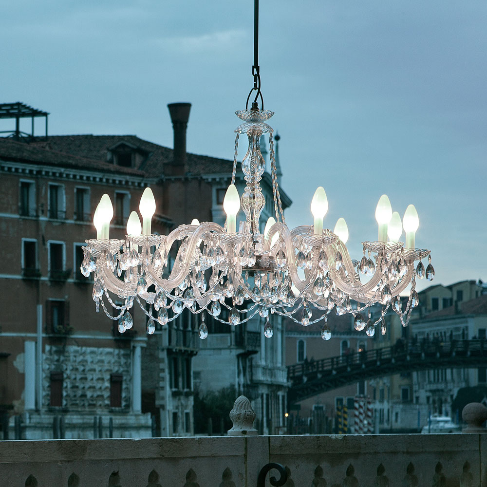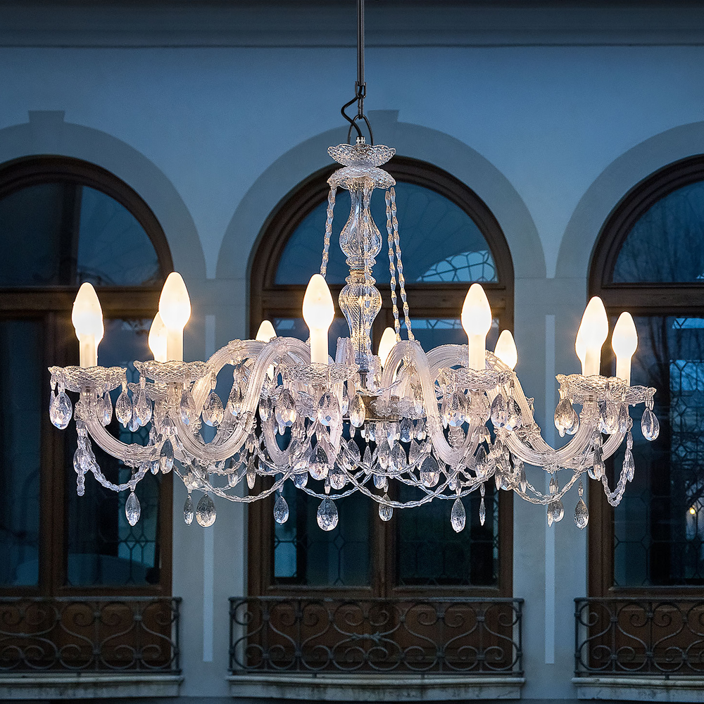 The Outdoor Cut Crystal Chandelier, let the glamour defy the rain and bad weather with this outdoor waterproof IP66 rated 12 arm chandelier. Offering total protection against water. Manufactured from high-tech materials and decorated with Polycarbonate pendants and prisms for outdoor use, and Cut crystal pendants and octagons for indoor use – such as bathrooms.