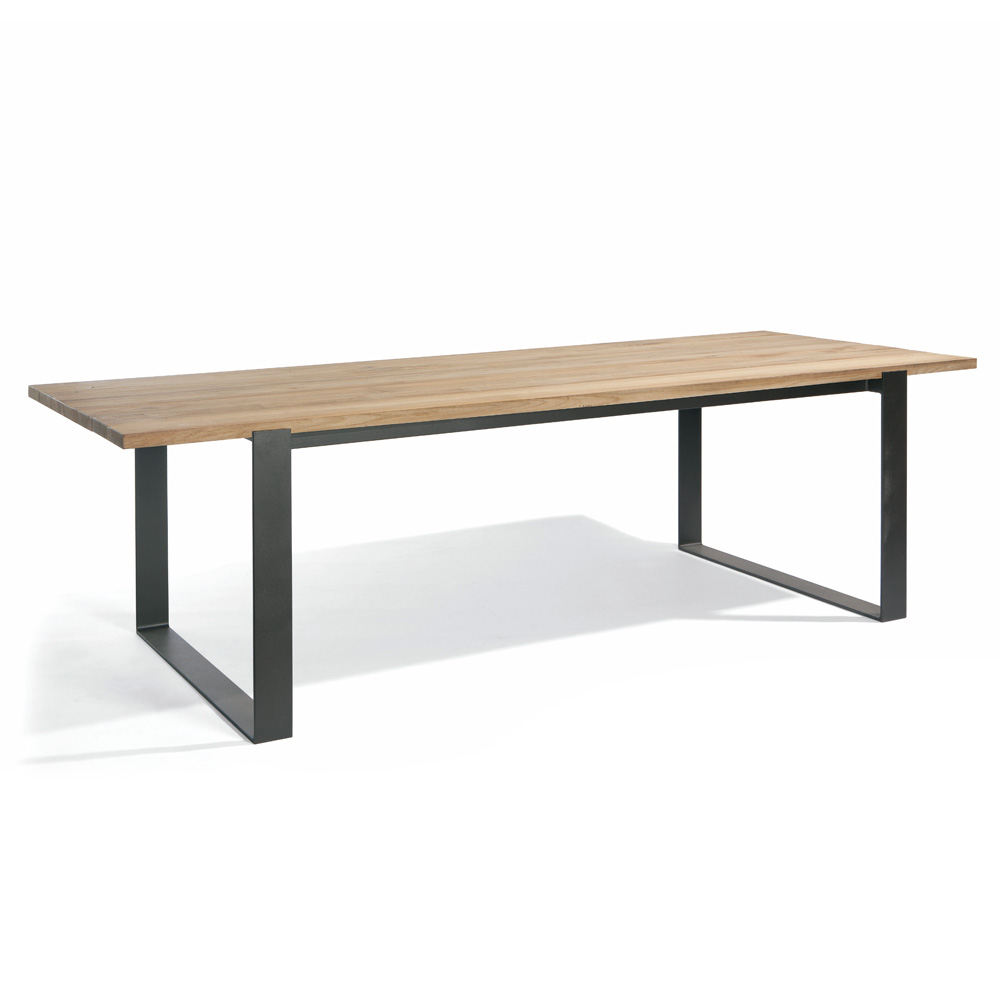The table and bench are created by hand. Minimal but striking by design, with fluid wrought iron bases in a matt black finish. Shown here with a brushed natural aged teak slatted table top and seat. Various finish combinations are available, as shown. Prices may vary. Various table sizes available, shown here at height 75 x width 270 cm x depth 107 cm. Bench, height 45 x width 270 cm x depth 40 cm.