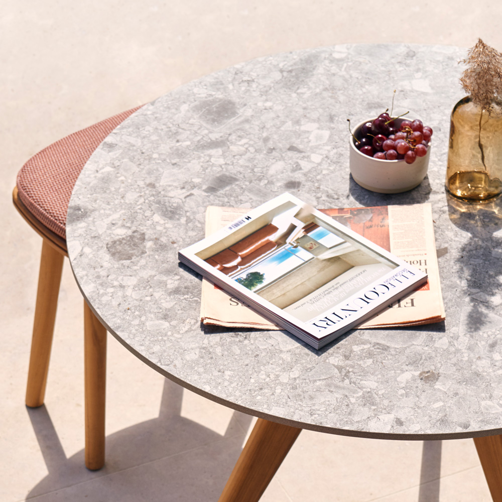 Superbly executed by master craftsmen this set is outstanding in its use of luxury materials and attention to detail. Offering the ultimate in comfort and style. Smooth lines and beautiful teak finishes, curved with retro tones. A round ceramic fossil table top, creating a hygienic, resistant to fire and high temperature, durable, environment friendly surface that is suitable for indoor and outdoor use. Seat cushion upholstery shown here in a Terracotta fabric, 5 cm in depth. Technical complexity, each piece created by hand. Table, height 91 cm x diameter 100 cm. Chair, Height 74 cm x width 57 cm x depth 55 cm, seat height 40 cm. Weight 7 kg. Stool, height 49 cm x width 45 cm x depth 26 cm. Weight 4 kg. Swimming pool and sea water resistant and repellent. Easy to clean and maintain. Recyclable, GreenGuard certified, REACH certified. The finest of All Weather Fabrics, that have been specifically developed for outdoor use. The fabric is mass-coloured, UV-resistant and does not fade under the influence of light or sunshine. Also available various other combinations, as shown. Prices will vary. Protective covers also available by request.
