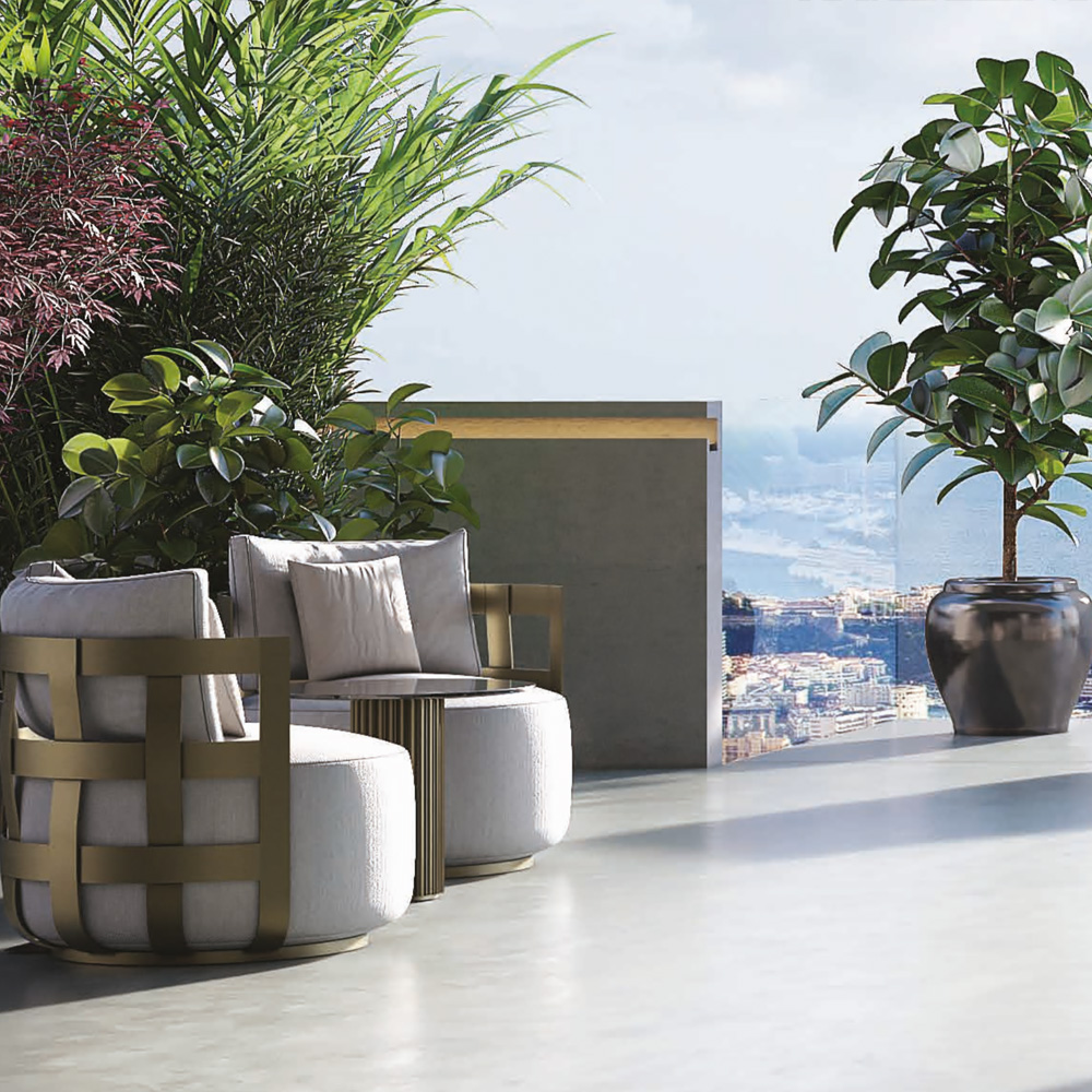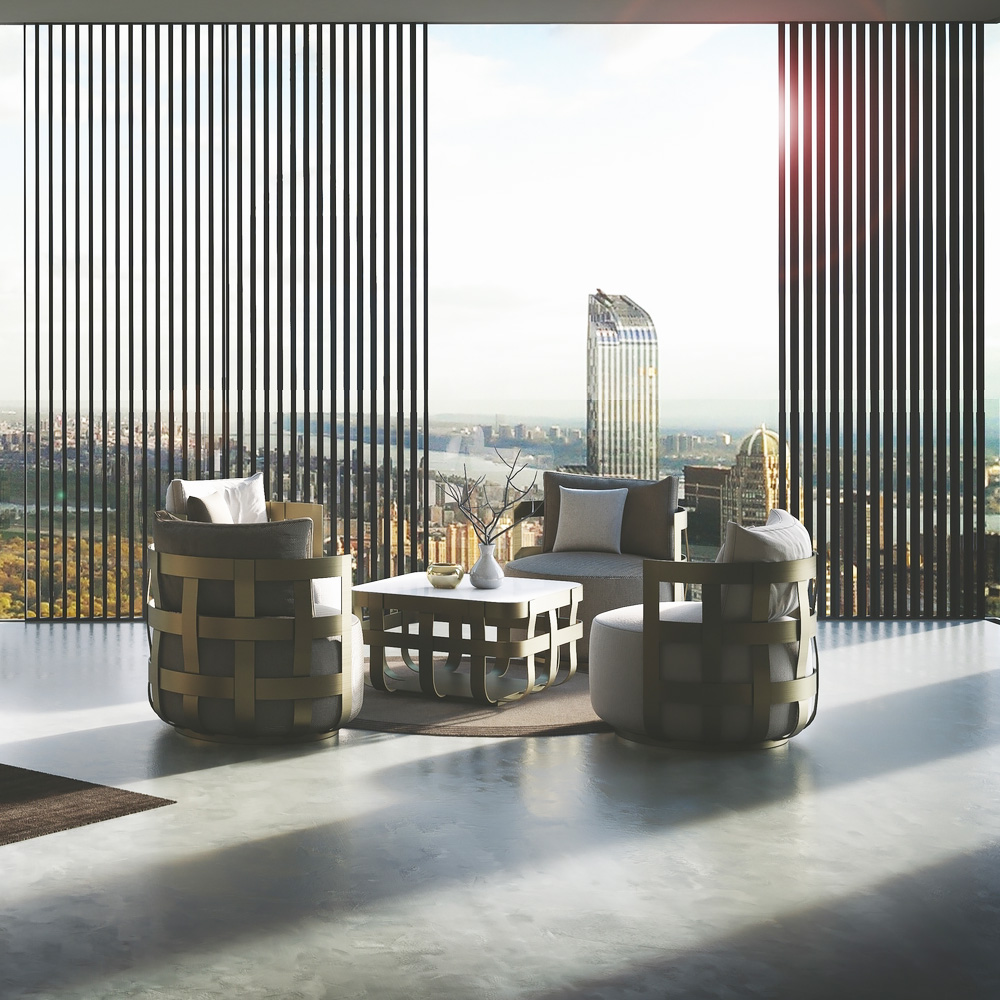 The perfect union of materials, a harmony of forms. The most beautiful Bronze finished aluminium intertwined structure being its defining feature. Seat height 36 cm. Upholstered in fabrics that are versatile both indoors and out. Made purely of acrylic fibres dyed in solution to ensure a stable pigmentation to UV rays, finished with protective anti-stain treatment. Fascinating, easy to wash and durable. Insured durability, designed to resist mould and mildew and are guaranteed against fading and deterioration. The final treatment applied on all fabrics is water-repellent and preventing ingrained dirt, making it easy to clean. Extremely simple maintenance. Rain cover also available, improving durability. Made of waterproof fabric used in the naval field, the Rain Cover is equipped with a drawstring that allows you to lock it at the base to prevent the wind from lifting it. Scatter cushion is available, but not included.