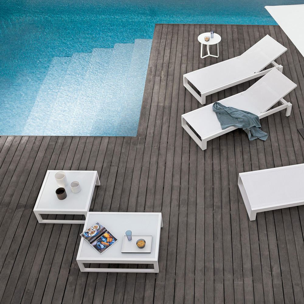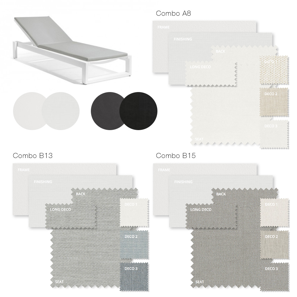 With a moveable back support, this concept comes with a seat and back cushion in one piece. Various complementary cushions are available. Shown here with a matt white powder coated aluminium frame, with a matching white fabric support and finally upholstered in an on trend taupe (Combo B15) or dove grey (Combo B13) fabric. Can be used with or without the padded seating. Superbly executed by master craftsmen, outstanding in its use of luxury materials and attention to detail. Technical complexity, each piece created by hand. Length 201 cm x depth 79 cm. Weight 20 kg. Swimming pool and sea water resistant and repellent. Easy to clean and maintain. Recyclable, GreenGuard certified, REACH certified. The finest of All Weather Fabrics, that have been specifically developed for outdoor use. The fabric is mass-coloured, UV-resistant and does not fade under the influence of light or sunshine. A black option as standard and various combinations are available, as shown. Protective cover also available by request. Prices will vary.