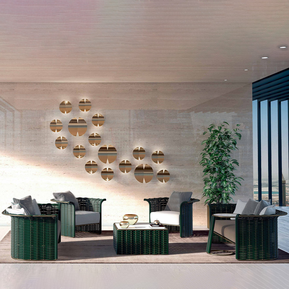 The perfect union of materials, a harmony of forms. The most beautiful metal linear structure, sandblasted, galvanised and then powder coated in a bronze finish. The weaves of rope its strong and defining feature in natural tones of grey or green as shown. Lightened by small gaps that create a play of light, shadow and air. Seat width 148 cm, seat depth 65 cm and seat height 40 cm. Upholstered in fabrics that are versatile both indoors and out. Made purely of acrylic fibres dyed in solution to ensure a stable pigmentation to UV rays, finished with protective anti-stain treatment. Fascinating, easy to wash and durable. A removable cover. Insured durability, designed to resist mould and mildew and are guaranteed against fading and deterioration. The final treatment applied on all fabrics is water-repellent and preventing ingrained dirt, making it easy to clean. Extremely simple maintenance. Rain cover also available, improving durability. Made of waterproof fabric used in the naval field, the Rain Cover is equipped with a drawstring that allows you to lock it at the base to prevent the wind from lifting it. Modular sofa and chaise styles available, allowing endless solutions. Seat cushion and four scatter cushions are included, 2 x 55 cm x 45 cm and 2 x 50 cm x 50 cm – others are available.