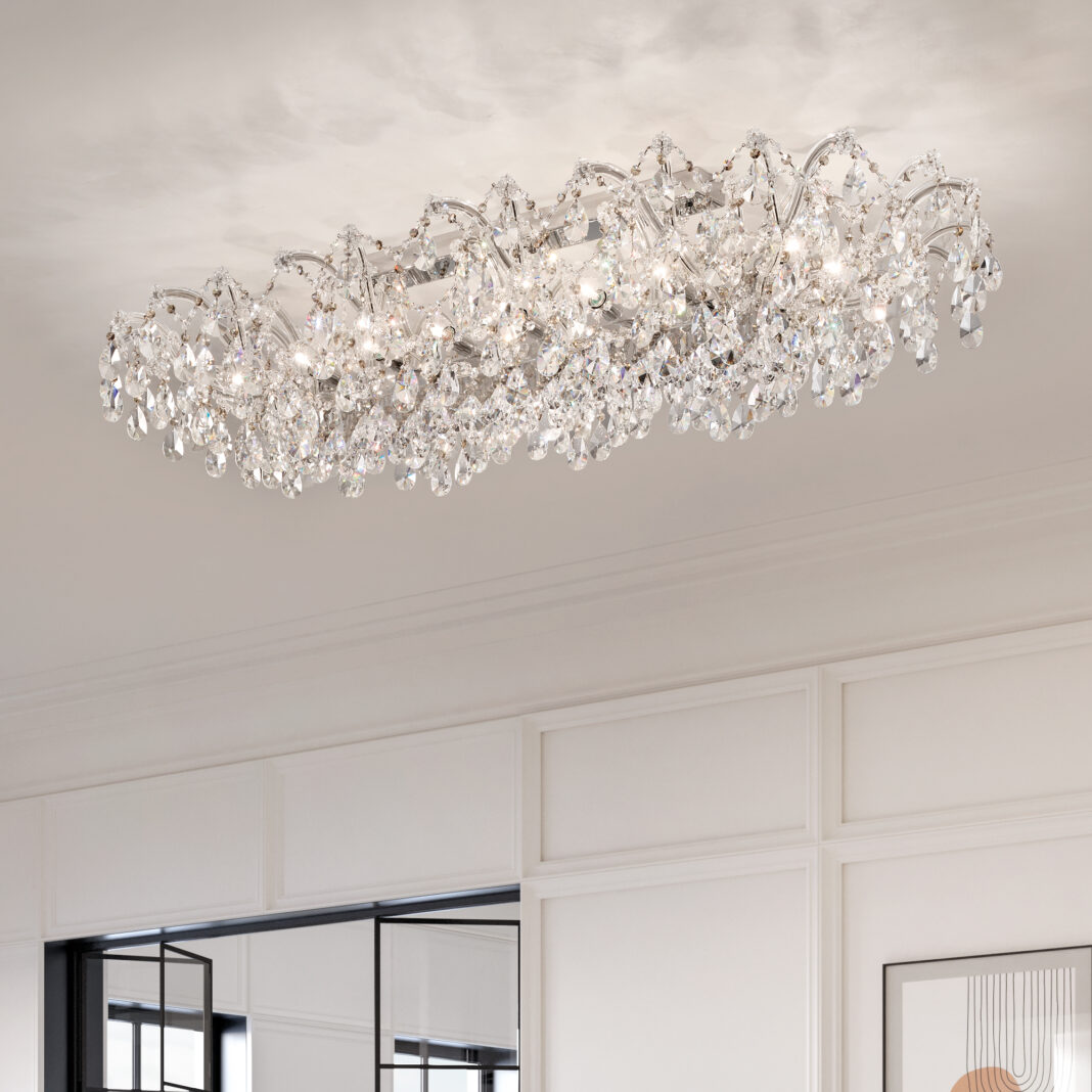 Elevating any space with sophistication. Its oval galvanised metal frame in a polished chrome finish with arms covered in clear glass, is adorned with dazzling crystals. Transparent with a dash of smoked, in either half cut glass, cut crystal or premium crystal. Radiating a warm and inviting glow.