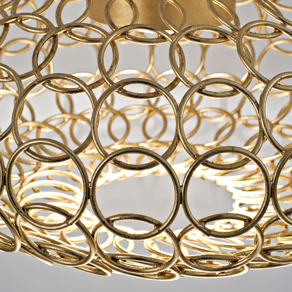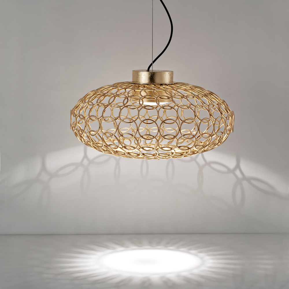 Oval Metal Light With Gold Leaf Finish. Offering a precise modern design, this oval shaped light is made of metal rings, welded together by hand by superb craftsmen to provide minimalist beauty. This delicate pendant is elegant but unobtrusive, complementing your interior design to fabulous effect.
